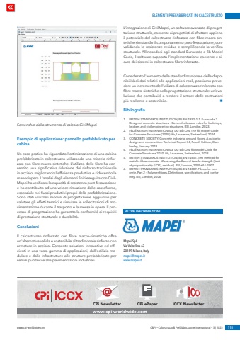 ELEMENTI PREFABBRICATI IN CALCESTRUZZOwww.cpi-worldwide.com C&PI %u2013 Calcestruzzo & Prefabbricazione International %u2013 5 | 2025 111Esempio di applicazione: pannello prefabbricato per cabina Un caso pratico ha riguardato l'ottimizzazione di una cabina prefabbricata in calcestruzzo utilizzando una miscela rinforzata con fibre macro-sintetiche. L%u2019utilizzo delle fibre ha consentito una significativa riduzione del rinforzo tradizionale in acciaio, migliorando l'efficienza produttiva e riducendo la manodopera. L'analisi degli elementi finiti eseguita con CivilMapei ha verificato la capacit%u00e0 di resistenza post-fessurazione e ha contribuito ad una veloce rimozione dalle casseforme, essenziale nei flussi produttivi propri della prefabbricazione. Sono stati utilizzati moduli di progettazione aggiuntivi per valutare gli effetti termici e simulare le sollecitazioni di movimentazione durante il trasporto e la messa in opera. Il processo di progettazione ha garantito la conformit%u00e0 ai requisiti di prestazione strutturale e durabilit%u00e0.ConclusioniIl calcestruzzo rinforzato con fibre macro-sintetiche offre un'alternativa valida e sostenibile al tradizionale rinforzo con armature in acciaio. Consente soluzioni innovative ed efficienti in una vasta gamma di applicazioni, dall'edilizia modulare e dalle infrastrutture alle strutture prefabbricate per servizi pubblici e alle pavimentazioni industriali.L'integrazione di CivilMapei, un software avanzato di progettazione strutturale, consente ai progettisti di sfruttare appieno il potenziale del calcestruzzo rinforzato con fibre macro-sintetiche simulando il comportamento post-fessurazione, convalidando le resistenze residue e semplificando la verifica strutturale. Allineandosi agli standard Eurocode e fib Model Code, il software supporta l'implementazione coerente e sicura dei sistemi in calcestruzzo fibrorinforzato.Considerato l'aumento della standardizzazione e della disponibilit%u00e0 di dati relativi alle applicazioni reali, possiamo prevedere un incremento dell%u2019utilizzo di calcestruzzo rinforzato con fibre macro-sintetiche nella progettazione strutturale: un%u2019evoluzione che contribuir%u00e0 a rendere il settore delle costruzioni pi%u00f9 resiliente e sostenibile. nBibliografia1. BRITISH STANDARDS INSTITUTION, BS EN 1992-1-1. Eurocode 2. Design of concrete structures - General rules and rules for buildings, bridges and civil engineering structures. BSI, London, 2023.2. F%u00c9D%u00c9RATION INTERNATIONALE DU B%u00c9TON. The fib Model Code for Concrete Structures (2020). fib, Lausanne, Switzerland, 2024.3. CONCRETE SOCIETY. Concrete industrial ground floors. A guide to design and construction. Technical Report 34, Fourth Edition, Camberley, January 2018.4. F%u00c9D%u00c9RATION INTERNATIONALE DU B%u00c9TON. fib Model Code for Concrete Structures 2010. fib, Lausanne, Switzerland, 2013.5. BRITISH STANDARDS INSTITUTION, BS EN 14651. Test method for metallic fibre concrete. Measuring the flexural tensile strength (limit of proportionality (LOP), residual). BSI, London, 2005+A1:2007.6. BRITISH STANDARDS INSTITUTION, BS EN 14889. Fibres for concrete. Part 2 %u2013 Polymer fibres. Definitions, specifications and conformity. BSI, London, 2006Screenshot dallo strumento di calcolo CivilMapeiALTRE INFORMAZIONIMapei SpAVia Valtellina 6320159 Milano, Italymapei@mapei.itwww.mapei.itCPi Newsletter CPi ePaper ICCX Newsletterwww.cpi-worldwide.com