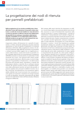 ELEMENTI PREFABBRICATI IN CALCESTRUZZO112 C&PI %u2013 Calcestruzzo & Prefabbricazione International %u2013 5 | 2025 www.cpi-worldwide.comNella progettazione di una struttura prefabbricata si deve affrontare il tema dell%u2019interazione tra pannelli e telaio strutturale. La scelta dei vincoli da installare tra i due elementi %u00e8 cruciale per garantire un%u2019efficace ritenuta anti-ribaltamento del pannello ed, al contempo, trasmettere sollecitazioni sismiche compatibili con le caratteristiche della struttura. Edilmatic propone una gamma di nodi strutturali che comprende sia connessioni fisse che scorrevoli. L%u2019argomento relativo all%u2019interazione tra i pannelli di rivestimento e il telaio strutturale sottoposto ad azioni sismiche rappresenta un tema di grande complessit%u00e0 e di notevole delicatezza nell%u2019ambito della progettazione sismica. Ci%u00f2 deriva principalmente dalle difficolt%u00e0 intrinseche nel prevedere e valutare eventuali effetti negativi che un irrigidimento eccessivo della struttura, causato dal vincolo tra pannelli e telaio, potrebbe determinare sul comportamento complessivo dell%u2019edificio durante un evento sismico. In particolare, il nodo strutturale che unisce i due elementi deve essere progettato con grande attenzione, affinch%u00e9 possa, in primo luogo, garantire l%u2019impossibilit%u00e0 di ribaltamento o di deformazioni pericolose del pannello stesso, soprattutto in risposta alle sollecitazioni statiche e sismiche che si verificano durante l%u2019evento. Per quanto concerne, invece, la possibile trasmissione delle sollecitazioni sismiche nel piano del pannello, si possono adottare due principali modalit%u00e0 di vincolo: da un lato, vincoli fissi, che garantiscono una connessione rigida e stabile; dall%u2019altro lato, vincoli scorrevoli, che consentono un certo grado di movimento e assorbono le energie sismiche in modo pi%u00f9 flessibile, riducendo potenzialmente gli effetti dannosi e le sollecitazioni interne all%u2019intera struttura. Vediamo di seguito le differenze.Nel contesto delle azioni sismiche che interessano un edificio, i vincoli di tipo rigido, comunemente definiti come vincoli fissi, assumono un ruolo di fondamentale importanza nella risposta strutturale. In questa configurazione, i pannelli di rivestimento o tamponamento sono costretti a seguire fedelmente il movimento del telaio strutturale durante le oscillazioni indotte dal sisma. Questo comportamento comporta che i pannelli, vincolati rigidamente, subiscano rotazioni rigide in modo alternato, sincronizzate con il moto del telaio principale. In pratica, i vincoli fissi impediscono qualsiasi spostamento relativo tra i pannelli e il resto della struttura, generando cos%u00ec delle forze orizzontali nel telaio stesso. La trasmissione di tali forze %u00e8 direttamente proporzionale all%u2019accelerazione sismica e alla dinamica delle oscillazioni. La loro entit%u00e0 dipende anche dalle caratteristiche di massa, rigidit%u00e0 e comportamento dei pannelli, che, sotto questa configurazione, diventano elementi che si comportano come parti integranti della massa oscillante della struttura, contribuendo a definire i modi di vibrare complessivi del sistema ed influenzando le modalit%u00e0 di risposta dinamica globale. In fase di modellazione strutturale, questa interazione tra pannelli e telaio deve essere analizzata con attenzione, poich%u00e9 i pannelli, con i vincoli rigidi, partecipano attivamente ai modi di vibrare della costruzione. Questo comporta che i modi di oscillazione e le frequenze proprie della torre o dell%u2019edificio risultino modificati rispetto a un modello senza pannelli o con vincoli pi%u00f9 flessibili. Tuttavia, spesso nella realt%u00e0 si valuta che tale coinvolgimento possa aver effetti peggiorativi sulla risposta sismica, in particolare per quanto riguarda l%u2019irrigidimento strutturale e le deformazioni che possono generare sollecitazioni elevate in alcuni nodi critici.La progettazione dei nodi di ritenuta per pannelli prefabbricati Edilmatic S.P.A., 460202 Pegognaga (MN), ItaliaTelaio con pannelli con vincoli scorrevoli (a) e con vincoli fissi(b).a) b)