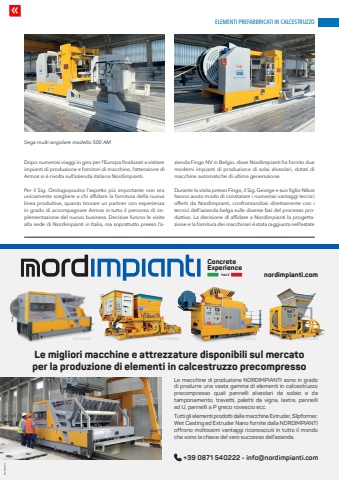 ELEMENTI PREFABBRICATI IN CALCESTRUZZOwww.cpi-worldwide.com C&PI %u2013 Calcestruzzo & Prefabbricazione International %u2013 5 | 2025 119EXTRUDER NANOnordimpianti.comLe migliori macchine e attrezzature disponibili sul mercatoper la produzione di elementi in calcestruzzo precompressoLe macchine di produzione NORDIMPIANTI sono in grado di produrre una vasta gamma di elementi in calcestruzzo precompresso quali pannelli alveolari da solaio e da tamponamento, travetti, paletti da vigna, lastre, pannelli ad U, pannelli a P greco rovescio ecc. Tutti gli elementi prodotti dalle macchine Extruder, Slipformer, Wet Casting ed Extruder Nano fornite dalla NORDIMPIANTI offrono moltissimi vantaggi riconosciuti in tutto il mondo che sono la chiave del vero successo dell%u2019azienda.%ue138+39 0871 540222 - info@nordimpianti.comadv | webnue.itEXTRUDER SLIPFORMER WET CASTINGConcreteExperience ITA LYDopo numerosi viaggi in giro per l%u2019Europa finalizzati a visitare impianti di produzione e fornitori di macchine, l%u2019attenzione di Armos si %u00e8 rivolta sull%u2019azienda italiana Nordimpianti.Per il Sig. Orologopoulos l%u2019aspetto pi%u00f9 importante non era unicamente scegliere a chi affidare la fornitura della nuova linea produttiva, quanto trovare un partner con esperienza in grado di accompagnare Armos in tutto il percorso di implementazione del nuovo business. Decisive furono le visite alla sede di Nordimpianti in Italia, ma soprattutto presso l%u2019azienda Fingo NV in Belgio, dove Nordimpianti ha fornito due moderni impianti di produzione di solai alveolari, dotati di macchine automatiche di ultima generazione.Durante la visita presso Fingo, il Sig. George e suo figlio Nikos hanno avuto modo di constatare i numerosi vantaggi tecnici offerti da Nordimpianti, confrontandosi direttamente con i tecnici dell%u2019azienda belga sulle diverse fasi del processo produttivo. La decisione di affidare a Nordimpianti la progettazione e la fornitura dei macchinari %u00e8 stata raggiunta nell%u2019estate Sega multi-angolare modello 500 AM