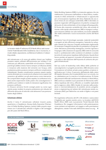 ICCX SPECIAL12 C&PI %u2013 Calcestruzzo & Prefabbricazione International %u2013 5 | 2025 www.cpi-worldwide.comALTRE INFORMAZIONINORTHAFRICA 2024www.iccx.org SupportersPlatinum Sponsor Silver Sponsor Organisation Official Airlinesdel calcestruzzo e di come gli additivi chimici per l%u2019edilizia possano essere utilizzati efficacemente per rendere il calcestruzzo pi%u00f9 efficiente, sostenibile ed economico. Tuttavia, poich%u00e9 gli additivi chimici hanno sempre un%u2019influenza diretta e reciproca sulla reazione del cemento con l%u2019acqua, nella produzione pratica possono sempre verificarsi complicazioni indesiderate. Queste complicazioni possono essere rapidamente eliminate se si conoscono le relazioni tra le reazioni del cemento e gli additivi e se gli utenti sanno come intervenire. Per comprendere meglio questo aspetto, la conferenza includer%u00e0 anche esperimenti molto pratici che coinvolgeranno il pubblico per mettere in risalto le interazioni significative che possono verificarsi.In chiusura verranno forniti consigli pratici su come ogni utente possa rendere la propria produzione pi%u00f9 robusta ed efficiente dal punto di vista dei costi attraverso l%u2019uso personalizzato degli additivi.Calcestruzzo cellulareAnche il tema Il calcestruzzo cellulare trover%u00e0 posto, quest%u2019anno, a Casablanca. Amany Arafa, Executive Chairwoman di Delta Building Systems, parler%u00e0 delle proprie esperienze con il calcestruzzo cellulare in Egitto e del vantaggio per altri paesi del Nord Africa.Delta Building Systems (DBS) %u00e8 un%u2019azienda egiziana che sta ridefinendo il panorama dell%u2019edilizia in Nord Africa, trasformando le sfide ambientali e infrastrutturali in opportunit%u00e0 per un%u2019innovazione rispettosa del clima. Partendo da una visione chiara di uno sviluppo sostenibile, DBS %u00e8 diventata un pioniere regionale nell%u2019integrazione di pratiche consapevoli dal punto di vista ambientale e di tecnologie all%u2019avanguardia. Di fronte alla crescente variabilit%u00e0 del clima, alla scarsit%u00e0 di risorse e alla rapida urbanizzazione, DBS si impegna a sviluppare soluzioni edilizie non solo resilienti, ma anche adattabili alle realt%u00e0 ambientali e socio-economiche uniche del Nord Africa.Attraverso l%u2019uso di tecnologie avanzate, materiali sostenibili e progetti ad alta efficienza energetica, l%u2019azienda ha sviluppato metodi che riducono l%u2019impatto ambientale migliorando al contempo l%u2019integrit%u00e0 strutturale e le prestazioni a lungo termine. Attraverso partnership strategiche, ricerche rigorose e l%u2019impegno nella creazione di capacit%u00e0, DBS mette le comunit%u00e0 locali e i professionisti nelle condizioni di adottare e scalare tecniche di costruzione rispettose dell%u2019ambiente. Questi sforzi hanno portato ad approcci innovativi all%u2019isolamento termico e acustico e alla riduzione dell%u2019impronta di carbonio dei progetti infrastrutturali.Dal suo ruolo di leadership nella difesa delle politiche al coinvolgimento in progetti pionieristici, DBS dimostra come l%u2019innovazione nel settore privato possa guidare un%u2019azione significativa per il clima. Il percorso dell%u2019azienda dalla vision all%u2019impatto dimostra che la sostenibilit%u00e0 non %u00e8 un vincolo, ma un catalizzatore per la crescita e la trasformazione. Di fronte alle pressanti sfide del cambiamento climatico in Nord Africa, DBS continua a stabilire nuovi parametri di riferimento nell%u2019edilizia rispettosa del clima, offrendo un modello replicabile per la regione e oltre. DBS %u00e8 leader di mercato nella produzione e commercializzazione di prodotti, servizi, progettazione e engineering nel settore del calcestruzzo aerato autoclavato (AAC) per fabbriche con sede in Egitto e nei paesi limitrofi.Pre-registratevi all%u2019evento del 29 e 30 ottobre e assicuratevi il biglietto per questo evento unico. La location dell%u2019ICCX North Africa 2025 sar%u00e0 nuovamente l%u2019hotel Barcel%u00f3 Anfa Casablanca. Per maggiori informazioni sulla partecipazione come visitatori ed espositori, sul viaggio e sulle prenotazioni alberghiere, visitate il sito web dell%u2019evento www.iccx.org. nLa location della 4%u00b0 edizione ICCX North Africa sar%u00e0 nuovamente l%u2019hotel Barcel%u00f3 Anfa Casablanca. Qui si riuniscono, in modo ideale, esposizione, conferenza di settore e il networking serale.