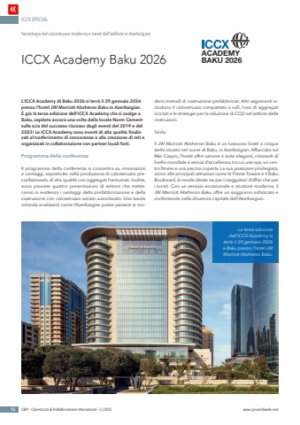 ICCX SPECIAL16 C&PI %u2013 Calcestruzzo & Prefabbricazione International %u2013 5 | 2025 www.cpi-worldwide.comL%u2019ICCX Academy di Baku 2026 si terr%u00e0 il 29 gennaio 2026 presso l%u2019hotel JW Marriott Absheron Baku in Azerbaigian. %u00c8 gi%u00e0 la terza edizione dell%u2019ICCX Academy che si svolge a Baku, ospitata ancora una volta dalla locale Norm Cement sulla scia del successo riscosso dagli eventi del 2019 e del 2023! Le ICCX Academy sono eventi di alta qualit%u00e0 finalizzati al trasferimento di conoscenze e alla creazione di reti e organizzati in collaborazione con partner locali forti.Programma della conferenzaIl programma della conferenza si concentra su innovazioni e vantaggi, soprattutto nella produzione di calcestruzzo preconfezionato di alta qualit%u00e0 con aggregati frantumati. Inoltre, sono previste quattro presentazioni di settore che metteranno in evidenza i vantaggi della prefabbricazione e della costruzione con calcestruzzo aerato autoclavato. Una tavola rotonda analizzer%u00e0 come l%u2019Azerbaigian possa passare ai moderni metodi di costruzione prefabbricati. Altri argomenti includono il calcestruzzo compattato a rulli, l%u2019uso di aggregati riciclati e le strategie per la riduzione di CO2 nel settore delle costruzioni.SedeIl JW Marriott Absheron Baku %u00e8 un lussuoso hotel a cinque stelle situato nel cuore di Baku, in Azerbaigian. Affacciato sul Mar Caspio, l%u2019hotel offre camere e suite eleganti, ristoranti di livello mondiale e servizi d%u2019eccellenza, tra cui una spa, un centro fitness e una piscina coperta. La sua posizione privilegiata, vicino alle principali attrazioni come le Flame Towers e il Baku Boulevard, lo rende ideale sia per i viaggiatori d%u2019affari che per i turisti. Con un servizio eccezionale e strutture moderne, il JW Marriott Absheron Baku offre un soggiorno sofisticato e confortevole nella dinamica capitale dell%u2019Azerbaigian.ICCX Academy Baku 2026Tecnologia del calcestruzzo moderna e trend dell%u2019edilizia in AzerbaigianACADEMYBAKU 2026La terza edizione dell%u2019ICCX Academy si terr%u00e0 il 29 gennaio 2026 a Baku presso l%u2019hotel JW Marriott Absheron Baku.