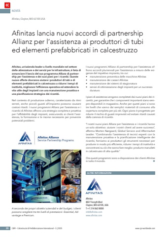 NOVIT%u00c020 C&PI %u2013 Calcestruzzo & Prefabbricazione International %u2013 5 | 2025 www.cpi-worldwide.comAfinitas, un%u2019azienda leader a livello mondiale nel settore delle attrezzature e dei servizi per le infrastrutture, %u00e8 lieta di annunciare il lancio del suo programma Allianz di partnership per l%u2019assistenza e dei suoi piani per i ricambi. Queste nuove offerte dovranno aiutare i produttori di tubi e di elementi prefabbricati in calcestruzzo a ridurre i tempi di inattivit%u00e0, migliorare l%u2019efficienza operativa ed estendere la vita utile degli impianti con una manutenzione proattiva e una pianificazione strategica dei ricambi.Nel contesto di produzione odierno, caratterizzato da ritmi serrati, anche piccoli guasti all%u2019impianto possono causare costosi ritardi. I nuovi programmi Allianz per l%u2019assistenza e i ricambi di Afinitas offrono una strategia completa e proattiva per l'affidabilit%u00e0 degli impianti, assicurando ai clienti l'assistenza, la formazione e le risorse necessarie per prevenire potenziali problemi.I nuovi programmi Allianz di partnership per l%u2019assistenza offrono accordi pluriennali per l%u2019assistenza a misura delle esigenze del rispettivo impianto, tra cui:%u2022 manutenzione preventiva delle macchine Afinitas%u2022 manutenzione dei casseri Afinitas%u2022 manutenzione dei sistemi di stagionatura%u2022 servizi di ottimizzazione degli impianti per un successo duraturoI piani di assistenza vengono completati dai nuovi piani dei ricambi, per garantire che i componenti importanti siano sempre disponibili in magazzino. Anche per questi piani vi sono tre livelli che vanno dai semplici materiali di consumo alla copertura completa per pi%u00f9 siti. Ogni piano %u00e8 progettato per ridurre il rischio di guasti imprevisti ed evitare ritardi causati dalla carenza di ricambi.%u201cI nostri nuovi piani Allianz per l%u2019assistenza e i ricambi hanno un solo obiettivo: aiutare i nostri clienti ad avere successo%u201d, afferma Morten N%u00f8rgaard, Global Service and Aftermarket Leader. %u201cCombinando l'assistenza di tecnici esperti con la manutenzione proattiva e la pianificazione intelligente dei ricambi, forniamo ai produttori gli strumenti necessari per produrre in modo pi%u00f9 efficiente, ridurre i tempi di inattivit%u00e0 e concentrarsi su ci%u00f2 che sanno fare meglio: produrre manufatti in calcestruzzo di alta qualit%u00e0.%u201dOra questi programmi sono a disposizione dei clienti Afinitas in tutto il mondo. nAfinitas lancia nuovi accordi di partnership Allianz per l%u2019assistenza ai produttori di tubi ed elementi prefabbricati in calcestruzzoAfinitas, Clayton, MO 63105 USAA seconda dei propri obiettivi aziendali e del budget, i clienti possono scegliere tra tre livelli di prestazioni: Essential, Advantage e Premium.ALTRE INFORMAZIONIAfinitas8027 Forsyth BlvdClayton, MO 63105, USAT +1 314 862 8000info@afinitas.comwww.afinitas.com