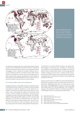 NOVIT%u00c024 C&PI %u2013 Calcestruzzo & Prefabbricazione International %u2013 5 | 2025 www.cpi-worldwide.comUn esempio di materiali idonei %u00e8 quello dei prodotti di scarto ceramici come mattonelle e frammenti di gres. Lo studio ha rilevato che questi materiali possono avere propriet%u00e0 reattive vantaggiose, simili a quelle dei prodotti sostitutivi del cemento tradizionali, facendo ricordare tecniche delle vecchie strutture in calcestruzzo romane. Fanno parte degli altri prodotti sostitutivi del cemento identificati le scorie smaltite in discarica provenienti dalle fonderie di rame, nickel o zinco, le scorie dei rottami di acciaio fuso e la cenere volante.IA e il futuro della scienza del calcestruzzoGuardando al futuro, il team MIT prevede di ampliare le capacit%u00e0 del sistema IA per valutare uno spettro ancora pi%u00f9 esteso di tipologie di materiali. L%u2019obiettivo %u00e8 anche quello di convalidare i promettenti candidati sperimentali. Questa ricerca indica come le tecnologie IA accelerino l%u2019innovazione nella scienza e nelle tecnologie del calcestruzzo. Automatizzando complessi processi di screening del materiale che richiederebbero prima approfondite analisi manuali e ricerche nella letteratura, l%u2019IA consente un%u2019identificazione pi%u00f9 rapida ed estesa di promettenti prodotti sostitutivi del cemento. Questo, oltre ad accelerare i tempi di sviluppo, apre le porte a una vasta gamma di materiali, sottoprodotti industriali reperiti localmente e minerali naturali compresi, con ogni probabilit%u00e0 sfuggiti in precedenza. Per i produttori di calcestruzzo ne conseguono nuove possibilit%u00e0 per progettare miscele pi%u00f9 efficienti sotto il profilo delle risorse, a misura degli specifici obiettivi ecologici ed economici. In questo modo, l%u2019IA supporta gli sforzi dell%u2019industria a ridurre le emissioni di carbonio e al tempo stesso a mantenere la resistenza, la durabilit%u00e0 e gli standard di sicurezza.Il lavoro %u00e8 stato svolto con il MIT Concrete Sustainability Hub (CSHub) [3], supportato dalla Concrete Advancement Foundation [4] e dall%u2019Olivetti Group [5], con il finanziamento supplementare di MIT-IBM Watson AI Lab [6]. Fanno parte degli autori dello studio il Dr. Soroush Mahjoubi, il Dr. Vineeth Venugopal, il Dr. Ipek Bensu Manav, il Dr. Hessam AzariJafari, il Dr. Randolph Kirchain e la professoressa Elsa Olivetti. n[1] https://www.astm.org/[2] https://store.astm.org/c1897-20.html[3] https://cshub.mit.edu/[4] https://www.concreteadvancement.org/[5] https://olivetti.mit.edu/[6] https://mitibmwatsonailab.mit.edu/[7] https://www.nature.com/articles/s43246-025-00820-4La disponibilit%u00e0 dei materiali reattivi con propriet%u00e0 pozzolaniche (in alto) o comportamento idraulico (in basso), rappresentata dal numero di siti identificati per ogni Paese. [7]