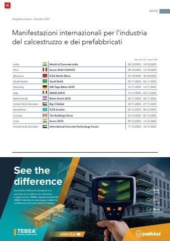 NOVIT%u00c0www.cpi-worldwide.com C&PI %u2013 Calcestruzzo & Prefabbricazione International %u2013 5 | 2025 25India World of Concrete India 08.10.2025 - 10.10.2025Peru Excon 2024 CAPECO 09.10.2025 - 12.10.2025Morocco ICCX North Africa 29.10.2025 - 30.10.2025Saudi Arabia Saudi Build 03.11.2025 - 06.11.2025Germany IAB Tage Beton 2025 12.11.2025 - 13.11.2025Italy MADE EXPO 19.11.2025 - 22.11.2025Netherlands Beton Event 2025 20.11.2025 - 20.11.2025United Arab Emirates Big 5 Global 24.11.2025 - 27.11.2025Kazakhstan ICCX Eurasia 03.12.2025 - 04.12.2025Canada The Buildings Show 03.12.2025 - 05.12.2025India Excon 2025 09.12.2025 - 13.12.2025United Arab Emirates International Concrete Technology Forum 17.12.2025 - 18.12.2025Manifestazioni internazionali per l%u2019industria del calcestruzzo e dei prefabbricatiProspettive ottobre %u2013 dicembre 2025Stato come da 1%u00b0 agosto 2025peikko.itAumentate l%u2019efficienza energetica e la sicurezza di un edificio con l%u2019elemento a taglio termico TEBEA%u00ae valutato tramite ETA. TEBEA%u00ae mantiene la casa sicura e calda e fa la differenza che si pu%u00f2 vedere e sentire.See the differenceETA valutatoNon infiammabilemarcatoElemento a taglio termico TEBEA%u00ae