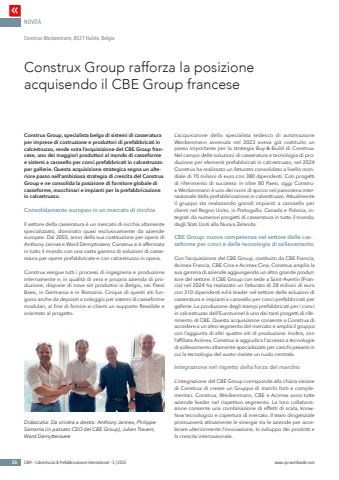 NOVIT%u00c026 C&PI %u2013 Calcestruzzo & Prefabbricazione International %u2013 5 | 2025 www.cpi-worldwide.comConstrux Group, specialista belga di sistemi di casseratura per imprese di costruzione e produttori di prefabbricati in calcestruzzo, rende nota l%u2019acquisizione del CBE Group francese, uno dei maggiori produttori al mondo di casseforme e sistemi a carosello per conci prefabbricati in calcestruzzo per gallerie. Questa acquisizione strategica segna un ulteriore passo nell%u2019ambiziosa strategia di crescita del Construx Group e ne consolida la posizione di fornitore globale di casseforme, macchinari e impianti per la prefabbricazione in calcestruzzo.Consolidamento europeo in un mercato di nicchiaIl settore della casseratura %u00e8 un mercato di nicchia altamente specializzato, dominato quasi esclusivamente da aziende europee. Dal 2003, anno della sua costituzione per opera di Anthony Jannes e Ward Demyttnaere, Construx si %u00e8 affermata in tutto il mondo con una vasta gamma di soluzioni di casseratura per opere prefabbricate e con calcestruzzo in opera.Construx esegue tutti i processi di ingegneria e produzione internamente e, in qualit%u00e0 di vera e propria azienda di produzione, dispone di nove siti produttivi in Belgio, nei Paesi Bassi, in Germania e in Romania. Cinque di questi siti fungono anche da depositi a noleggio per sistemi di casseforme modulari, al fine di fornire ai clienti un supporto flessibile e orientato al progetto.L%u2019acquisizione dello specialista tedesco di automazione Weckenmann avvenuta nel 2023 aveva gi%u00e0 costituito un passo importante per la strategia Buy-&-Build di Construx. Nel campo delle soluzioni di casseratura e tecnologia di produzione per elementi prefabbricati in calcestruzzo, nel 2024 Construx ha realizzato un fatturato consolidato a livello mondiale di 70 milioni di euro con 380 dipendenti. Con progetti di riferimento di successo in oltre 80 Paesi, oggi Construx-Weckenmann %u00e8 uno dei nomi di spicco nel panorama internazionale della prefabbricazione in calcestruzzo. Attualmente il gruppo sta realizzando grandi impianti a carosello per clienti nel Regno Unito, in Portogallo, Canada e Polonia, integrati da numerosi progetti di casseratura in tutto il mondo, dagli Stati Uniti alla Nuova Zelanda.CBE Group: nuova competenza nel settore delle casseforme per conci e delle tecnologie di sollevamentoCon l%u2019acquisizione del CBE Group, costituito da CBE Francia, Acimex Francia, CBE Cina e Acimex Cina, Construx amplia la sua gamma di aziende aggiungendo un altro grande produttore del settore. Il CBE Group con sede a Saint-Avertin (Francia) nel 2024 ha realizzato un fatturato di 28 milioni di euro con 310 dipendenti ed %u00e8 leader nel settore delle soluzioni di casseratura e impianti a carosello per conci prefabbricati per gallerie. La produzione degli stampi prefabbricati per i conci in calcestruzzo dell'Eurotunnel %u00e8 uno dei tanti progetti di riferimento di CBE. Questa acquisizione consente a Construx di accedere a un altro segmento del mercato e amplia il gruppo con l%u2019aggiunta di altri quattro siti di produzione. Inoltre, con l%u2019affiliata Acimex, Construx si aggiudica l%u2019accesso a tecnologie di sollevamento altamente specializzate per carichi pesanti in cui la tecnologia del vuoto riveste un ruolo centrale.Integrazione nel rispetto della forza del marchioL%u2019integrazione del CBE Group corrisponde alla chiara visione di Construx di creare un Gruppo di marchi forti e complementari. Construx, Weckenmann, CBE e Acimex sono tutte aziende leader nel rispettivo segmento. La loro collaborazione consente una combinazione di effetti di scala, knowhow tecnologico e copertura di mercato. Il team dirigenziale promuover%u00e0 attivamente le sinergie tra le aziende per accelerare ulteriormente l'innovazione, lo sviluppo dei prodotti e la crescita internazionale.Construx Group rafforza la posizione acquisendo il CBE Group franceseConstrux Weckenmann, 8531 Hulste, BelgioDidascalia: Da sinistra a destra: Anthony Jannes, Philippe Samama (in passato CEO del CBE Group), Julien Travers, Ward Demyttenaere