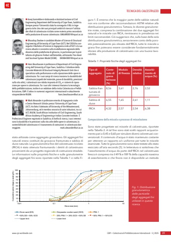 TECNICA DEL CALCESTRUZZOwww.cpi-worldwide.com C&PI %u2013 Calcestruzzo & Prefabbricazione International %u2013 5 | 2025 31stata utilizzata come aggregato grossolano. Gli aggregati fini naturali erano costituiti da grovacca frantumata e sabbia di dune naturale. La granulometria fine del calcestruzzo riciclato (fRCA) %u00e8 stata ottenuta frantumando i detriti di calcestruzzo provenienti da un progetto regionale di costruzione stradale. Le informazioni sulle propriet%u00e0 fisiche e sulle granulometrie degli aggregati fini sono riportate nella Tabella 1 e nella Figura 1. %u00c8 emerso che la maggior parte delle sabbie naturali non era conforme alle raccomandazioni ASTM relative alla distribuzione granulometrica. Tuttavia, le diverse granulometrie miste, compresa la combinazione dei due aggregati fini naturali e le miscele con fRCA, rientravano in prevalenza nei limiti raccomandati. Ci%u00f2 suggerisce che, sulla base della sola distribuzione granulometrica, senza tenere conto della porosit%u00e0 potenzialmente pi%u00f9 elevata dell'fRCA, tutte le miscele a grana fine potevano essere considerate fondamentalmente idonee alla produzione di calcestruzzo con una buona lavorabilit%u00e0.Tabella 1: Propriet%u00e0 fisiche degli aggregati finiTipo di aggregatoContenuto di grana farinosa (%)Modulo di finezzaDensit%u00e0 relativaAssorbimento di acqua (%)Sabbia frantumata di grovacca8,56 3,61 2,76 2,52Sabbia di dune6,55 1,65 2,61 1,11fRCA 4,32 2,57 2,54 6,38Composizione della miscela e processo di miscelazioneSono state progettate sei miscele di calcestruzzo, riportate nella Tabella 2. A tal fine sono stati scelti rapporti acqua/cemento pari a 0,45 e 0,60 per simulare diversi calcestruzzi convenzionali. Il contenuto d'acqua %u00e8 stato mantenuto costante per ottenere un rapporto a/c uniforme per tutte le miscele esaminate. Tutte le granulometrie sono state testate allo stato essiccato all'aria secondo [5]. In letteratura si sottolinea che l'assorbimento d'acqua da parte dell'fRCA nel calcestruzzo fresco %u00e8 compreso tra il 49 % e l'89 % della capacit%u00e0 massima di assorbimento e che finora non %u00e8 disponibile un metodo n Areej Gamieldien %u00e8 dottoranda e Assistant Lecturer al Civil Engineering Department dell%u2019University of Cape Town, Sudafrica. Sempre presso l%u2019Universit%u00e0 citata ha conseguito il BSc in Ingegneria civile. Uno dei suoi principali ambiti di ricerca %u00e8 l'utilizzo dei rifiuti di calcestruzzo riciclato come materia prima secondaria nella produzione di nuovo calcestruzzo. GMLARE001@myuct.ac.zan Bhooshay Dookee %u00e8 candidato Master of Science di Structural Engineering all%u2019University of Cape Town (UCT). Nel 2024 ha conseguito il Bachelor of Science in Ingegneria civile all%u2019UCT e la sua ricerca attuale si concentra sulla modellazione regionale della dinamica delle piattaforme di ghiaccio, in particolare per la piattaforma di ghiaccio Fimbul nell%u2019Antartide, utilizzando l%u2019Ice-sheet and Sea-level System Model (ISSM). DKXBHO001@myuct.ac.zan Hans Beushausen %u00e8 professore al Department of Civil Engineering dell%u2019University of Cape Town, Sudafrica. %u00c8 direttore della Concrete Materials & Structural Integrity Research Unit che si specializza sulla performance e sulla riparazione delle opere in calcestruzzo. Tra i suoi campi di ricerca troviamo la durabilit%u00e0 del calcestruzzo (aspetti del materiale, prove di durabilit%u00e0, previsioni sulla vita utile), i calcestruzzi con ridotta impronta di CO2 e i sistemi di riparazione per opere in calcestruzzo. Tra i suoi altri interessi troviamo la tecnologia della prefabbricazione, inoltre %u00e8 un redattore della rivista Calcestruzzo e Prefabbricazione, C&PI. %u00c8 attivo in numerosi organismi internazionali e attualmente vicepresidente RILEM. hans.beushausen@uct.ac.zan Mark Alexander %u00e8 professore emerito di Ingegneria civile e Senior Research Scholar presso l%u2019University of Cape Town (UCT). Ha fatto il dottorato all%u2019University of the Witwatersrand, Johannesburg, ed %u00e8 membro onorario di varie istituzioni, tra cui UCT, RILEM, South African Institution of Civil Engineering, South African Academy of Engineering e Indian Concrete Institute. %u00c8 Professional Engineer registrato in Sudafrica. A livello di ricerca, i suoi interessi sono la durabilit%u00e0 e le previsioni sulla vita utile delle opere in calcestruzzo, la sostenibilit%u00e0 del calcestruzzo e il risanamento di costruzioni in calcestruzzo danneggiate. mark.alexander@uct.ac.zafifffifflfiffififlfi%u001afi%u0019fi%u0018fi%u0017fi%u0016fifffififi%u0015fiff fi%u0015ff ff fffi%u0014%u0013%u0012%u0013%u0011%u0010%u000f%u000e%u000c%u000b%u000c%u0009%u0008%u000c%u0007%u000f%u0010%u0006%u000c%u000b%u0010%u0005%u0005%u000e%u0007%u0006%u000b%u0004%u0003%u0001%u000e%u000c%u000c%u000b%u0005%u000e%u000c%u000b%u0004%u0012%u0012%u0081%u0013%u0007%u000c%u000b%u0005%u0010%u0007%u008d%u000b%u0004%u0081%u0001 %u008f%u0009%u000c%u0090%u009d%u0010%u0008%u00a0%u000c%u000b%u0008%u0009%u0013%u0005%u00ad%u000c%u0009%u000b%u0005%u0010%u0007%u008d%u000b%u0004%u008f%u0014%u0001 %u0080%u0082%u0083%u000bff%u001afi%u0003%u000b%u0081%u0001%u000b%u0084%u000b%u001afi%u0003%u000b%u008f%u0014%u0001 ffl%u001a%u0003%u000b%u0080%u0082%u0083%u000bff%u000b%u0084%u000bffl%u001a%u0003%u000b%u008f%u0014%u0001%u000b%u0084%u000b%u001afi%u0003%u000b%u0081%u0001 %u001afi%u0003%u000b%u0080%u0082%u0083%u000bff%u000b%u0084%u000b%u001afi%u0003%u000b%u0081%u0001%u0085%u000c%u0009%u000b%u0011%u000e%u0012%u000e%u000f %u0086%u0087%u009d%u000c%u0009%u000b%u0011%u000e%u0012%u000e%u000fFig. 1: Distribuzione granulometrica delle particelle degli aggregati fini utilizzati in questa ricerca.