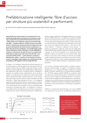 TECNICA DEL CALCESTRUZZO38 C&PI %u2013 Calcestruzzo & Prefabbricazione International %u2013 5 | 2025 www.cpi-worldwide.comApprofondimenti sperimentali sul comportamento e sul potenziale degli elementi strutturali in calcestruzzo rinforzato con fibre d%u2019acciaio (Steel Fibre Reinforced Concrete - SFRC). Ridurre per migliorare: l%u2019approccio prestazionale del SFRC: L%u2019implementazione di fibre d%u2019acciaio nei prefabbricati in calcestruzzo armato permette di migliorare le prestazioni ottimizzando allo stesso tempo la produzione. Le fibre d%u2019acciaio Dramix di Bekaert, riconoscibili dalla caratteristica estremit%u00e0 uncinata, rinforzano in modo affidabile le strutture in calcestruzzo da oltre 50 anni. La combinazione delle diverse sagomature dell%u2019uncino (3D, 4D, 5D) con le propriet%u00e0 del filo di base %u2014 quali resistenza a trazione e allungamento ultimo %u2014 assicura un meccanismo di rottura sicuro e controllato, di tipo duttile, che contribuisce sia alla durabilit%u00e0 sia all%u2019integrit%u00e0 strutturale degli elementi.Le Figure 1 e 2 mostrano l%u2019influenza dei diversi parametri sul comportamento e sulle prestazioni del calcestruzzo fibrorinforzato con fibre d%u2019acciaio (SFRC), utilizzando le fibre uncinate delle serie Dramix 3D, 4D e 5D. Queste fibre si differenziano per sagomatura dell%u2019uncino, resistenza del filo, lunghezza e rapporto di snellezza (L/d), caratteristiche che le rendono adatte a un%u2019ampia gamma di applicazioni, dal controllo delle fessure all%u2019aumento della capacit%u00e0 portante. Come evidenziato nella Figura 2A, l%u2019incremento della resistenza allo sfilo della fibra %u2014 legata alla tipologia di uncino %u2014 e la maggiore capacit%u00e0 a trazione del filo d%u2019acciaio comportano un aumento delle resistenze flessionali residue, ossia la resistenza a flessione post-fessurazione misurata con prove standardizzate secondo la normativa EN 14651. La resistenza a compressione della matrice di calcestruzzo %u00e8 anch%u2019essa un parametro fondamentale, poich%u00e9 influisce direttamente sull%u2019efficienza dell%u2019ancoraggio delle fibre. Il progettista dispone di un%u2019ampia gamma di fibre Dramix tra cui selezionare quella pi%u00f9 adatta a bilanciare l%u2019aderenza alla matrice con le propriet%u00e0 meccaniche e la capacit%u00e0 di allungamento del filo. La Figura 2B mette in evidenza l%u2019influenza della geometria della fibra, mostrando che a parit%u00e0 di lunghezza (ad esempio L = 60 mm), un diametro inferiore %u2014 e quindi un rapporto L/d pi%u00f9 elevato %u2014 si traduce in prestazioni superiori, come nel caso delle fibre Dramix 4D. Nel caso specifico delle fibre Dramix 4D 80/60 (L = 60 mm, d = 0,75 mm) impiegate in un calcestruzzo classe C32/40, la Figura 2C dimostra come l%u2019aumento della dose di fibre, ovvero del numero di fibre nel volume di controllo, migliori significativamente le prestazioni meccaniche. Infine, la Figura 2D evidenzia come la capacit%u00e0 flessionale residua aumenti in funzione della resistenza a compressione del calcestruzzo.Una recente campagna sperimentale, condotta congiuntamente dall%u2019Universit%u00e0 di Cagliari e da Bekaert (Puppio, Di Giacinto, et al., %u201cPrecast steel-fiber reinforced concrete (SFRC) on beams: Results from an experimental campaign,%u201d doi: 10.1016/j.engstruct.2025.120738), ha analizzato come la sostituzione parziale dell%u2019armatura tradizionale con fibre d%u2019acciaio possa migliorare significativamente il comportamento strutturale degli elementi prefabbricati in calcestruzzo. I risultati sono particolarmente promettenti per progettisti e produttori interessati a ridurre la congestione delle armature, accelerare i tempi di produzione e aumentare le prestazioni meccaniche.Sebbene il calcestruzzo fibrorinforzato con acciaio (SFRC) non rappresenti una novit%u00e0, la sua diffusione negli elementi Prefabbricazione intelligente: fibre d%u2019acciaio per strutture pi%u00f9 sostenibili e performantiNV Bekaert SA, 8550 Zwevegem, Belgion Danilo Di Giacinto, Global Technical & Business Development Manager, Bekaert & Falconix EngineeringFig. 1: Fibre d%u2019acciaio Dramix per il rinforzo del calcestruzzo: resistenza del filo e geometria dell%u2019uncino con riferimento alle serie 3D, 4D e 5D