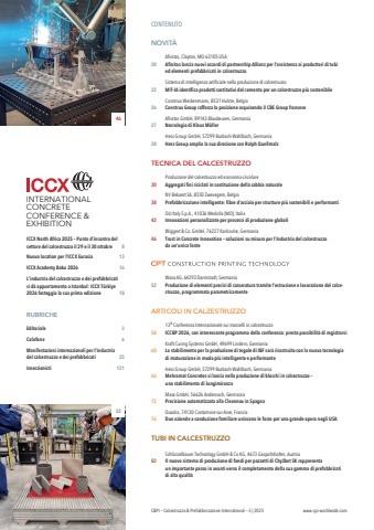 C&PI %u2013 Calcestruzzo & Prefabbricazione International %u2013 5 | 2025 www.cpi-worldwide.comCONTENUTONOVIT%u00c0Afinitas, Clayton, MO 63105 USA20%u0009 Afinitas lancia nuovi accordi di partnership Allianz per l%u2019assistenza ai produttori di tubied elementi prefabbricati in calcestruzzoSistema di intelligenza artificiale nella produzione di calcestruzzo22%u0009 MIT-IA identifica prodotti sostitutivi del cemento per un calcestruzzo pi%u00f9 sostenibileConstrux Weckenmann, 8531 Hulste, Belgio26%u0009 Construx Group rafforza la posizione acquisendo il CBE Group franceseAfinitas GmbH, 89143 Blaubeuren, Germania27%u0009 Necrologio di Klaus M%u00fcllerHess Group GmbH, 57299 Burbach-Wahlbach, Germania28%u0009 Hess Group amplia la sua direzione con Ralph QuellmalzTECNICA DEL CALCESTRUZZOProduzione del calcestruzzo ed economia circolare30%u0009 Aggregati fini riciclati in sostituzione della sabbia naturaleNV Bekaert SA, 8550 Zwevegem, Belgio38%u0009 Prefabbricazione intelligente: fibre d%u2019acciaio per strutture pi%u00f9 sostenibili e performantiOLI Italy S.p.A., 41036 Medolla (MO), Italia42%u0009 Innovazioni personalizzate per processi di produzione globaliWiggert & Co. GmbH, 76227 Karlsruhe, Germania 46%u0009 Trust in Concrete Innovation %u2013 soluzioni su misura per l%u2019industria del calcestruzzoda un%u2019unica fonteWasa AG, 64293 Darmstadt, Germania 52%u0009 Produzione di elementi precisi di casseratura tramite l%u2019estrusione e lavorazione del calcestruzzo, programmata parametricamenteARTICOLI IN CALZESTRUZZO13a Conferenza Internazionale sui masselli in calcestruzzo58%u0009 ICCBP 2026, con interessante programma della conferenza: presto possibilit%u00e0 di registrarsiKraft Curing Systems GmbH, 49699 Lindern, Germania60%u0009 Lo stabilimento per la produzione di tegole di IBF sar%u00e0 ricostruito con la nuova tecnologiadi maturazione in modo pi%u00f9 intelligente e performanteHess Group GmbH, 57299 Burbach-Wahlbach, Germania66%u0009 Mehramat Concretes si lancia nella produzione di blocchi in calcestruzzo %u2013uno stabilimento di lungimiranzaMasa GmbH, 56626 Andernach, Germania 72%u0009 Precisione automatizzata alla Cleannox in SpagnaQuadra, 74130 Contamine-sur-Arve, Francia76%u0009 Due aziende a conduzione familiare uniscono le forze per una grande opera negli USATUBI IN CALCESTRUZZOSchl%u00fcsselbauer Technology GmbH & Co KG, 4673 Gaspoltshofen, Austria82%u0009 Il nuovo sistema di produzione di fondi per pozzetti di Chy%u017ebet SK rappresentaun importante passo in avanti verso il completamento della sua gamma di prefabbricatidi alta qualit%u00e05246ICCX North Africa 2025 %u2013 Punto d%u2019incontro delsettore del calcestruzzo il 29 e il 30 ottobre 8Nuova location per l%u2019ICCX Eurasia 13ICCX Academy Baku 2026 16L%u2019industria del calcestruzzo e dei prefabbricatisi d%u00e0 appuntamento a Istanbul: ICCX T%u00fcrkiye2026 festeggia la sua prima edizione 18RUBRICHEEditoriale%u0009 3Colofone%u0009 6Manifestazioni internazionali per l%u2019industriadel calcestruzzo e dei prefabbricati 25Inserzionisti%u0009 121INTERNATIONAL CONCRETECONFERENCE & EXHIBITION