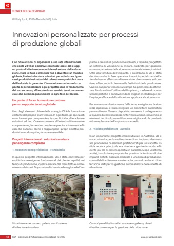 TECNICA DEL CALCESTRUZZO42 C&PI %u2013 Calcestruzzo & Prefabbricazione International %u2013 5 | 2025 www.cpi-worldwide.comCon oltre 60 anni di esperienza e una rete internazionale che conta 24 filiali operative con stock locale, Oli %u00e8 oggi un punto di riferimento mondiale nel settore della vibrazione. Nata in Italia e cresciuta fino a diventare un marchio globale, l%u2019azienda fornisce soluzioni per ottimizzare i processi produttivi nei settori del calcestruzzo prefabbricato e dell%u2019industria in generale. L%u2019innovazione continua e la capacit%u00e0 di personalizzare ogni progetto sono le fondamenta del suo successo, affiancate da un servizio tecnico-commerciale che accompagna il cliente in ogni fase del lavoro.Un punto di forza: formazione continua per un supporto tecnico globaleUno degli elementi chiave della strategia Oli %u00e8 la formazione costante del proprio team tecnico. In ogni filiale, gli specialisti sono formati per comprendere le specificit%u00e0 locali e adattare soluzioni ad hoc. Questo consente all%u2019azienda di intervenire con prontezza, fornendo consulenze precise e interventi efficaci che aiutano i clienti a raggiungere i propri obiettivi produttivi in modo rapido, sicuro e sostenibile.Progetti internazionali: soluzioni su misura per esigenze complesse1. Produzione conci prefabbricati %u2013 Francia/ItaliaIn questo progetto internazionale, Oli %u00e8 stata coinvolta per soddisfare tre esigenze fondamentali del cliente: rapidit%u00e0 nei tempi di produzione, qualit%u00e0 elevata del manufatto e contenimento dei costi. Dopo un%u2019analisi tecnica dettagliata dell%u2019impianto e dei cicli di produzione richiesti, il team ha progettato un sistema di vibrazione su misura, calibrato per garantire una compattazione del calcestruzzo ottimale in tempi minimi.Oltre alla fornitura dell%u2019impianto, il contributo di Oli %u00e8 stato decisivo anche in fase operativa. I tecnici specializzati dell%u2019azienda hanno effettuato diverse visite direttamente sul cantiere, affiancando il cliente nelle fasi iniziali della produzione. Questo supporto tecnico sul campo ha permesso di ottimizzare fin da subito l%u2019utilizzo dell%u2019impianto, trasferendo conoscenze pratiche e condividendo le migliori metodologie per l%u2019impiego efficace della vibrazione applicata al calcestruzzo.Per aumentare ulteriormente l%u2019efficienza e migliorare la sicurezza operativa, %u00e8 stato integrato un connettore automatico personalizzato. Questo dispositivo consente il collegamento al quadro di controllo senza l%u2019intervento umano, riducendo al minimo i rischi sul posto di lavoro e migliorando la produttivit%u00e0 complessiva dell%u2019impianto a carosello.2. %u0009 Viadotto prefabbricato %u2013 AustraliaIn un importante progetto infrastrutturale in Australia, Oli %u00e8 stata coinvolta per la realizzazione di un impianto destinato alla produzione di elementi prefabbricati per un viadotto. La sfida tecnica principale era riuscire a gestire in modo efficiente pi%u00f9 file di casseri operativi in parallelo. Dopo un%u2019attenta analisi, la soluzione proposta ha previsto la fornitura di due impianti distinti, ciascuno dedicato a una linea di produzione, controllabili a distanza tramite radiocomando e dotati di interfaccia HMI per la gestione automatizzata delle ricette di vibrazione.Innovazioni personalizzate per processi di produzione globaliOLI Italy S.p.A., 41036 Medolla (MO), ItaliaVista interna del cassero galleria con il sistema di vibrazione installatoControl panel fissi installati su cassero galleria, dotati di radiocomando per la gestione della vibrazione