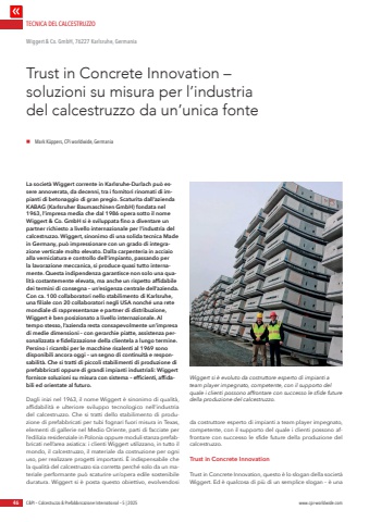 TECNICA DEL CALCESTRUZZO46 C&PI %u2013 Calcestruzzo & Prefabbricazione International %u2013 5 | 2025 www.cpi-worldwide.comLa societ%u00e0 Wiggert corrente in Karlsruhe-Durlach pu%u00f2 essere annoverata, da decenni, tra i fornitori rinomati di impianti di betonaggio di gran pregio. Scaturita dall%u2019azienda KABAG (Karlsruher Baumaschinen GmbH) fondata nel 1963, l%u2019impresa media che dal 1986 opera sotto il nome Wiggert & Co. GmbH si %u00e8 sviluppata fino a diventare un partner richiesto a livello internazionale per l%u2019industria del calcestruzzo. Wiggert, sinonimo di una solida tecnica Made in Germany, pu%u00f2 impressionare con un grado di integrazione verticale molto elevato. Dalla carpenteria in acciaio alla verniciatura e controllo dell%u2019impianto, passando per la lavorazione meccanica, si produce quasi tutto internamente. Questa indipendenza garantisce non solo una qualit%u00e0 costantemente elevata, ma anche un rispetto affidabile dei termini di consegna %u2013 un%u2019esigenza centrale dell%u2019azienda. Con ca. 100 collaboratori nello stabilimento di Karlsruhe, una filiale con 20 collaboratori negli USA nonch%u00e9 una rete mondiale di rappresentanze e partner di distribuzione, Wiggert %u00e8 ben posizionato a livello internazionale. Al tempo stesso, l%u2019azienda resta consapevolmente un%u2019impresa di medie dimensioni %u2013 con gerarchie piatte, assistenza personalizzata e fidelizzazione della clientela a lungo termine. Persino i ricambi per le macchine risalenti al 1969 sono disponibili ancora oggi %u2013 un segno di continuit%u00e0 e responsabilit%u00e0. Che si tratti di piccoli stabilimenti di produzione di prefabbricati oppure di grandi impianti industriali: Wiggert fornisce soluzioni su misura con sistema %u2013 efficienti, affidabili ed orientate al futuro.Dagli inizi nel 1963, il nome Wiggert %u00e8 sinonimo di qualit%u00e0, affidabilit%u00e0 e ulteriore sviluppo tecnologico nell%u2019industria del calcestruzzo. Che si tratti dello stabilimento di produzione di prefabbricati per tubi fognari fuori misura in Texas, elementi di gallerie nel Medio Oriente, parti di facciate per l%u2019edilizia residenziale in Polonia oppure moduli stanza prefabbricati nell%u2019area asiatica: i clienti Wiggert utilizzano, in tutto il mondo, il calcestruzzo, il materiale da costruzione per ogni uso, per realizzare progetti importanti. %u00c8 indispensabile che la qualit%u00e0 del calcestruzzo sia corretta perch%u00e9 solo da un materiale performante pu%u00f2 scaturire un%u2019opera edile sostenibile duratura. Wiggert si %u00e8 posta questo obiettivo, evolvendosi da costruttore esperto di impianti a team player impegnato, competente, con il supporto del quale i clienti possono affrontare con successo le sfide future della produzione del calcestruzzo.Trust in Concrete InnovationTrust in Concrete Innovation, questo %u00e8 lo slogan della societ%u00e0 Wiggert. Ed %u00e8 qualcosa di pi%u00f9 di un semplice slogan %u2013 %u00e8 una Trust in Concrete Innovation %u2013 soluzioni su misura per l%u2019industria del calcestruzzo da un%u2019unica fonteWiggert & Co. GmbH, 76227 Karlsruhe, Germania n Mark K%u00fcppers, CPi worldwide, GermaniaWiggert si %u00e8 evoluto da costruttore esperto di impianti a team player impegnato, competente, con il supporto del quale i clienti possono affrontare con successo le sfide future della produzione del calcestruzzo.