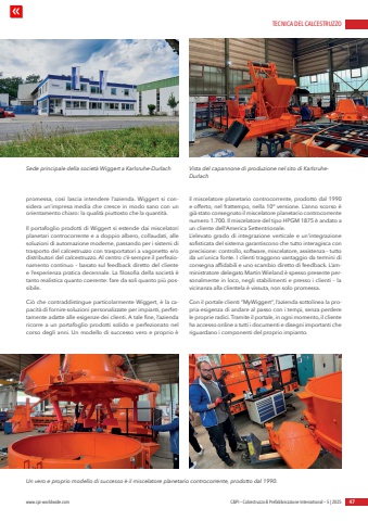 TECNICA DEL CALCESTRUZZOwww.cpi-worldwide.com C&PI %u2013 Calcestruzzo & Prefabbricazione International %u2013 5 | 2025 47promessa, cos%u00ec lascia intendere l%u2019azienda. Wiggert si considera un%u2019impresa media che cresce in modo sano con un orientamento chiaro: la qualit%u00e0 piuttosto che la quantit%u00e0.Il portafoglio prodotti di Wiggert si estende dai miscelatori planetari controcorrente e a doppio albero, collaudati, alle soluzioni di automazione moderne, passando per i sistemi di trasporto del calcestruzzo con trasportatori a vagonetto e/o distributori del calcestruzzo. Al centro c%u2019%u00e8 sempre il perfezionamento continuo %u2013 basato sul feedback diretto del cliente e l%u2019esperienza pratica decennale. La filosofia della societ%u00e0 %u00e8 tanto realistica quanto coerente: fare da soli quanto pi%u00f9 possibile.Ci%u00f2 che contraddistingue particolarmente Wiggert, %u00e8 la capacit%u00e0 di fornire soluzioni personalizzate per impianti, perfettamente adatte alle esigenze dei clienti. A tale fine, l%u2019azienda ricorre a un portafoglio prodotti solido e perfezionato nel corso degli anni. Un modello di successo vero e proprio %u00e8 il miscelatore planetario controcorrente, prodotto dal 1990 e offerto, nel frattempo, nella 10%u00b0 versione. L%u2019anno scorso %u00e8 gi%u00e0 stato consegnato il miscelatore planetario controcorrente numero 1.700. Il miscelatore del tipo HPGM 1875 %u00e8 andato a un cliente dell%u2019America Settentrionale.L%u2019elevato grado di integrazione verticale e un%u2019integrazione sofisticata del sistema garantiscono che tutto interagisca con precisione: controllo, software, miscelatore, assistenza %u2013 tutto da un%u2019unica fonte. I clienti traggono vantaggio da termini di consegna affidabili e uno scambio diretto di feedback. L%u2019amministratore delegato Martin Wieland %u00e8 spesso presente personalmente in loco, negli stabilimenti e presso i clienti %u2013 la vicinanza alla clientela %u00e8 vissuta, non solo promessa.Con il portale clienti %u201cMyWiggert%u201c, l%u2019azienda sottolinea la propria esigenza di andare al passo con i tempi, senza perdere le proprie radici. Tramite il portale, in ogni momento, il cliente ha accesso online a tutti i documenti e disegni importanti che riguardano i componenti del proprio impianto.Sede principale della societ%u00e0 Wiggert a Karlsruhe-Durlach Vista del capannone di produzione nel sito di KarlsruheDurlachUn vero e proprio modello di successo %u00e8 il miscelatore planetario controcorrente, prodotto dal 1990.