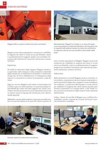 TECNICA DEL CALCESTRUZZO48 C&PI %u2013 Calcestruzzo & Prefabbricazione International %u2013 5 | 2025 www.cpi-worldwide.comWiggert punta sulla progettazione avanzata per soddisfare le esigenze dei clienti in modo ancora pi%u00f9 flessibile, veloce e qualitativamente di maggiore pregio e per proiettare l%u2019importanza del materiale da costruzione calcestruzzo, insieme, nel futuro.EngineeringGli ambiti di esperienza degli ingegneri Wiggert risiedono, in particolare, nello sviluppo e nella produzione industriale degli impianti per la realizzazione di prodotti in calcestruzzo di ogni tipo. Al centro dell%u2019attenzione c%u2019%u00e8 l%u2019integrazione degli impianti e componenti nei sistemi di produzione a valle dei clienti.Oggi pi%u00f9 che mai, Wiggert vuole essere un team player che si mette in gioco in veste di partner e si assume le proprie responsabilit%u00e0 per creare cos%u00ec valori aggiunti per i propri committenti. Sia il know-how tecnico sia le esperienze pluriennali nei diversi campi di impiego del calcestruzzo sono ulteriori aspetti apportati.Affidabilit%u00e0, rispetto delle scadenze e garanzia di qualit%u00e0 sono solo una piccola selezione di punti che clienti e partner di tutto il mondo apprezzano di Wiggert. Wiggert punta sulla modernit%u00e0 per soddisfare le esigenze dei clienti in modo ancora pi%u00f9 flessibile, veloce e qualitativamente di maggiore pregio e per proiettare l%u2019importanza del materiale da costruzione calcestruzzo, insieme, nel futuro.FabbricazioneNella produzione, la societ%u00e0 Wiggert punta su macchine ultra-moderne. La produzione dei suoi impianti comprende impianti automatici di taglio laser, piegatrici e robot di saldatura che realizzano i componenti dell%u2019impianto in modo preciso per soddisfare le esigenze dei clienti. Questi impianti sono azionati ampiamente con energia solare, il che rende l%u2019intero processo di produzione degli impianti molto rispettoso dell%u2019ambiente.Inoltre, i sistemi di controllo di Wiggert sono certificati UL e soddisfano, quindi, i requisiti dei controlli anche per il mercato americano e canadese.Wiggert offre un proprio sistema di pulizia automatico. Recentemente, Wiggert ha investito in un secondo capannone di produzione a Karlsruhe-Palmbach, dal momento che le capacit%u00e0 nella sede principale non erano pi%u00f9 sufficienti e un%u2019ulteriore crescita non era possibile a causa delle realt%u00e0 locali.Vista dei reparti di costruzione e assistenza