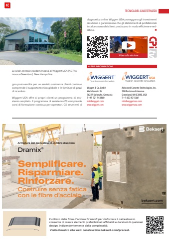TECNICA DEL CALCESTRUZZOgno post-vendita per un servizio assistenza clienti continuo comprende il supporto tecnico globale e le forniture di pezzi di ricambio.Wiggert USA offre ai propri clienti un programma di assistenza ampliato. Il programma di assistenza P3 comprende corsi di formazione continua per operatori. Gli strumenti di diagnostica online Wiggert USA proteggono gli investimenti dei clienti e garantiscono che gli stabilimenti di prefabbricati in calcestruzzo dei clienti producano in modo efficiente e redditizio. nALTRE INFORMAZIONIWiggert & Co. GmbH Wachhausstr. 3b 76227 Karlsruhe, Germania T +49 721 943460info@wiggert.com www.wiggert.comAdvanced Concrete Technologies, Inc.300 Portsmouth AvenueGreenland, NH 03840, USAT +1 603 4315661 info@wiggertusa.comwww.wiggertusa.comVideo sulla relazioneLa sede centrale nordamericana di Wiggert USA (ACT) si trova a Greenland, New Hampshirebekaert.comDramix%u00aeSemplificare. Risparmiare. Rinforzare.Armatura del calcestruzzo in fibra d%u2019acciaioL%u2019utilizzo delle fibre d%u2019acciaio Dramix%u00ae per rinforzare il calcestruzzo consente di creare elementi prefabbricati affidabili e duraturi di qualsiasi design, indipendentemente dalla complessit%u00e0. Visita il nostro sito web: construction.bekaert.com/precast.Costruire senza fatica con le fibre d%u2019acciaio