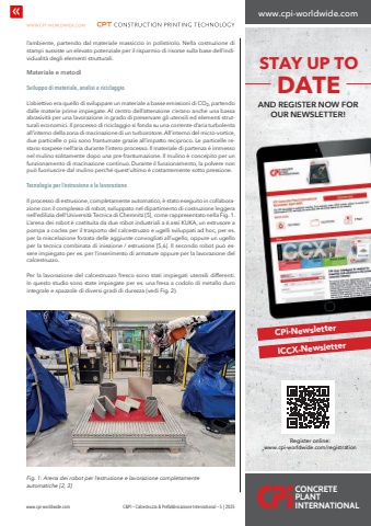 www.cpi-worldwide.com C&PI %u2013 Calcestruzzo & Prefabbricazione International %u2013 5 | 2025l%u2019ambiente, partendo dal materiale massiccio in polistirolo. Nella costruzione di stampi sussiste un elevato potenziale per il risparmio di risorse sulla base dell%u2019individualit%u00e0 degli elementi strutturali.Materiale e metodiSviluppo di materiale, analisi e riciclaggioL%u2019obiettivo era quello di sviluppare un materiale a basse emissioni di CO2, partendo dalle materie prime impiegate. Al centro dell%u2019attenzione c%u2019erano anche una bassa abrasivit%u00e0 per una lavorazione in grado di preservare gli utensili ed elementi strutturali economici. Il processo di riciclaggio si fonda su una corrente d%u2019aria turbolenta all%u2019interno della zona di macinazione di un turborotore. All%u2019interno del micro-vortice, due particelle o pi%u00f9 sono frantumate grazie all%u2019impatto reciproco. Le particelle restano sospese nell%u2019aria durante l%u2019intero processo. Il materiale di partenza %u00e8 immesso nel mulino solitamente dopo una pre-frantumazione. Il mulino %u00e8 concepito per un funzionamento di macinazione continuo. Durante il funzionamento, la polvere non pu%u00f2 fuoriuscire dal mulino perch%u00e9 quest%u2019ultimo %u00e8 costantemente sotto pressione. Tecnologia per l%u2019estrusione e la lavorazioneIl processo di estrusione, completamente automatico, %u00e8 stato eseguito in collaborazione con il complesso di robot, sviluppato nel dipartimento di costruzione leggera nell%u2019edilizia dell%u2019Universit%u00e0 Tecnica di Chemnitz [5], come rappresentato nella Fig. 1. L%u2019arena dei robot %u00e8 costituita da due robot industriali a 6 assi KUKA, un estrusore a pompa a coclea per il trasporto del calcestruzzo e ugelli sviluppati ad hoc, per es. per la miscelazione forzata delle aggiunte convogliati all%u2019ugello, oppure un ugello per la tecnica combinata di iniezione / estrusione [5,6]. Il secondo robot pu%u00f2 essere impiegato per es. per l%u2019inserimento di armature oppure per la lavorazione del calcestruzzo.Per la lavorazione del calcestruzzo fresco sono stati impiegati utensili differenti. In questo studio sono state impiegate per es. una fresa a codolo di metallo duro integrale e spazzole di diversi gradi di durezza (vedi Fig. 2).Fig. 1: Arena dei robot per l%u2019estrusione e lavorazione completamente automatiche [2, 3]www.cpi-worldwide.comRegister online: www.cpi-worldwide.com/registrationCPi-NewsletterICCX-NewsletterSTAY UP TO DATEAND REGISTER NOW FOR OUR NEWSLETTER!CONCRETE PLANTINTERNATIONALTRADE JOURNALS FOR THE CONCRETE INDUSTRY