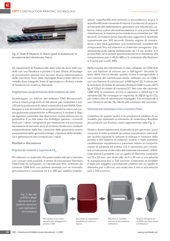 54 C&PI %u2013 Calcestruzzo & Prefabbricazione International %u2013 5 | 2025 www.cpi-worldwide.comGli esperimenti di fresatura allo stato indurito sono stati condotti con una fresatrice a portale a 5 assi. Grazie all%u2019impiego di servomotori assoluti non occorre alcuna referenziazione della macchina. Sono state impiegate frese a testa sferica di metallo duro integrale, frese di sgrossatura e finitura e teste di fresatura con inserti in diamante.Progettazione e programmazione delle traiettorie dei robotGrasshopper, un add-on del software CAD Rhinoceros%u00ae, serve a creare programmi di estrusione per controllare e pianificare la produzione di robot industriali a 6 assi KUKA. Grasshopper %u00e8 uno strumento di programmazione visivo per creare geometrie parametriche in Rhinoceros. Il risultato %u00e8 dato da algoritmi controllati che descrivono ovvero definiscono le geometrie. %u00c8 su tale base che KUKA|prc genera i comandi finali per i robot. I programmi per l%u2019estrusione e la successiva lavorazione di elementi vicini al contorno finale sono costituiti sostanzialmente dalle fasi: creazione della geometria ovvero preparazione della geometria target, creazione delle traiettorie e generazione dei comandi per i robot.Risultati e discussionePropriet%u00e0 dei materiali e risparmio di CO2Per ottenere un materiale che possa essere estruso e lavorato con i minori costi possibili, il centro di innovazione Steinbeis FiberCrete ha sviluppato un calcestruzzo fine, costituito da cemento CEM III/A, una polvere minerale con un intervallo granulometrico compreso tra 0 e 200 %u00b5m, additivi (stabilizzatore, superfluidificante primario e secondario) e acqua. Il superfluidificante consente di ridurre il contenuto di acqua e, unitamente allo stabilizzatore, garantisce una miscela pi%u00f9 uniforme, meno incline alla sedimentazione. In una prima fase di miscelazione, le materie prime solide sono miscelate per 140 secondi. Le materie prime liquide sono aggiunte e miscelate nuovamente per 320 secondi. Questo regime di miscelazione a due stadi garantisce una miscelazione completa dei componenti fino ad ottenere un materiale omogeneo. L%u2019assettamento pot%u00e9 essere caratterizzato da 13 cm. Inoltre, si %u00e8 provveduto ad accertare sperimentalmente la resistenza alla compressione pari a 40,01 MPa e la resistenza alla flessione in 4 punti pari a 6,01 MPa.Nella miscela del calcestruzzo %u00e8 stato utilizzato un CEM III/A con una frazione di volume pari a 520 kg/m%u00b3. Secondo lo stato della ricerca attuale, questa ricetta %u00e8 paragonabile a una miscela del calcestruzzo simile, utilizzata con un CEM I con una frazione di volume pari a 600 kg/m%u00b3 [2]. Il valore per le emissioni di clinker di cemento Portland CEM I %u00e8 pari a 875 kg di CO2/t di clinker di cemento [7]. Nel caso del cemento CEM III/A, le emissioni di CO2 si attestano a 543,8 kg /t di cemento [8]. Ne consegue un risparmio di 282,8 kg di CO2 per metro cubo di calcestruzzo impiegato. Ci%u00f2 corrisponde a una riduzione del 46,1%, riferita alle emissioni del cemento.Estrusione del calcestruzzo vicina al contorno finaleL%u2019obiettivo di questo studio %u00e8 la produzione additiva di un modello per realizzare un elemento di casseratura flessibile per produrre una fioriera, come rappresentata nella Fig. 3.Grazie a diversi esperimenti di estrusione per generare i primi campioni %u00e8 stato possibile accertare impostazioni essenziali per quanto riguarda la velocit%u00e0 di stampa in funzione della portata e del sistema di materiali. Inoltre, %u00e8 stato possibile caratterizzare impostazioni e parametri relativi al comportamento di partenza ed arresto. Ci%u00f2 %u00e8 necessario per consentire un%u2019estrusione ininterrotta del materiale ed evitare i difetti. L%u2019estrusione %u00e8 possibile con un ugello di diametro compreso tra 10 e 25 mm, uno strato alto da 5 a 20 mm e una velocit%u00e0 di avanzamento fino a 720 mm/min. L%u2019elemento di modello %u00e8 stato poi soggetto a produzione additiva con un ugello di diametro pari a 20 mm, uno strato alto 5 mm e una velocit%u00e0 pari a 720 mm/min.Fig. 3: Iter del prelievo degli elementi di casseratura necessari per realizzare il dimostratoreDimostratore con sottosquadro per alloggiare la striscia a LEDElemento di casseratura flessibile con anima in legnoElementi di modello derivati strutturalmente dall%u2019animaSingolo elemento di modello per l%u2019estrusione e la fresaturaFig. 2: Teste di fresatura di diversi gradi di durezza per la lavorazione del calcestruzzo fresco