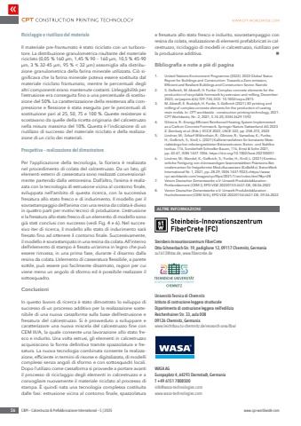 56 C&PI %u2013 Calcestruzzo & Prefabbricazione International %u2013 5 | 2025 www.cpi-worldwide.comRiciclaggio e riutilizzo del materialeIl materiale pre-frantumato %u00e8 stato riciclato con un turborotore. La distribuzione granulometrica risultante del materiale riciclato (0,05 % 160 %u00b5m, 1,45 % 90 %u2013 160 %u00b5m, 10,5 % 45-90 %u00b5m, 3 % 32-45 %u00b5m, 95 % < 32 %u00b5m) assomiglia alla distribuzione granulometrica della farina minerale utilizzata. Ci%u00f2 significava che la farina minerale poteva essere sostituita dal materiale riciclato frantumato, mentre le percentuali degli altri componenti erano mantenute costanti. L%u2019eleggibilit%u00e0 per l%u2019estrusione era conseguita fino a una percentuale di sostituzione del 50%. La caratterizzazione della resistenza alla compressione e flessione %u00e8 stata eseguita per le percentuali di sostituzione pari al 25, 50, 75 e 100 %. Queste resistenze si scostavano da quelle della ricetta originaria del calcestruzzo nella misura massima del 10%. Questa %u00e8 l%u2019indicazione di un riutilizzo di successo del materiale riciclato e della realizzazione di un ciclo dei materiali.Prospettiva %u2013 realizzazione del dimostratorePer l%u2019applicazione della tecnologia, la fioriera %u00e8 realizzata nel procedimento di colata del calcestruzzo. Da un lato, gli elementi esterni di casseratura sono realizzati convenzionalmente partendo dalla vetroresina. Dall%u2019altro, l%u2019anima %u00e8 realizzata con la tecnologia di estrusione vicina al contorno finale, sviluppata nell%u2019ambito di questa ricerca, con la successiva fresatura allo stato fresco e di indurimento. Il modello per il sovrastampaggio dell%u2019anima con una resina da colata %u00e8 diviso in quattro parti per motivi tecnici di produzione. L%u2019estrusione e la fresatura allo stato fresco di un elemento di modello sono gi%u00e0 stati conclusi con successo (vedi Fig. 4 e 6). Nel successivo iter di ricerca, il modello allo stato di indurimento sar%u00e0 fresato fino ad ottenere il contorno finale. Successivamente, il modello %u00e8 sovrastampato in una resina da colata. All%u2019interno dell%u2019elemento di stampo %u00e8 fissata un%u2019anima in legno che pu%u00f2 essere rimossa, in una prima fase, durante il disarmo dalla resina da colata. L%u2019elemento di casseratura flessibile, a parete sottile, pu%u00f2 essere poi facilmente disarmato, ragion per cui viene meno un angolo di sformo ed %u00e8 possibile realizzare il sottosquadro.ConclusioniIn questo lavoro di ricerca %u00e8 stato dimostrato lo sviluppo di successo di un processo additivo per la realizzazione sostenibile di una nuova cassaforma sulla base dell%u2019estrusione e fresatura del calcestruzzo. Si %u00e8 provveduto a sviluppare e caratterizzare una nuova miscela del calcestruzzo fine con CEM III/A, la quale consente una lavorazione allo stato fresco e indurito. Una volta estrusi, gli elementi in calcestruzzo acquisiscono la forma definitiva tramite spazzolatura e fresatura. La nuova tecnologia combinata consente la realizzazione, efficiente in termini di risorse e digitalizzata, di modelli complessi senza angoli di sformo e con sottosquadri locali. Dopo l%u2019utilizzo come cassaforma si provvede a portare avanti il processo di riciclaggio degli elementi in calcestruzzo e a convogliare nuovamente il materiale riciclato al processo di stampa. %u00c8 quindi nata una tecnologia complessa costituita dalle fasi: estrusione vicina al contorno finale, spazzolatura e fresatura allo stato fresco e indurito, sovrastampaggio con resina da colata, realizzazione di elementi prefabbricati in calcestruzzo, riciclaggio di modelli in calcestruzzo, riutilizzo per la produzione additiva. nBibliografia e note a pi%u00e8 di pagina1. United Nations Environment Programme (2022). 2022 Global Status Report for Buildings and Construction: Towards a Zero-emission, Efficient and Resilient Buildings and Construction Sector. Nairobi2. S. Gelbrich, M. Absto%u00df, H. Funke: Complex concrete elements for the production of recyclable formwork by extrusion and milling, December 2023, ce/papers 6(6):729-734, DOI: 10.1002/cepa.2815 3. M. Absto%u00df, E. Rudolph, H. Funke, S. Gelbrich (2021) 3D printing and milling of complex concrete elements for the production of casting resin molds. In: CPT worldwide - construction printing technology, 2021. CPT Worldwide, Nr.: 2, 2021, S.14-20, ISSN 2629-15924. Gliniorz, R.: Energy-Efficient Reinforced Heating System Implemented as a Carbon Concrete Formwork. Springer Nature Switzerland AG 2023 Z. Zembaty et al. (Eds.): ECCE 2022, LNCE 322, pp. 258%u2013272, 20235. Lindner, M.; Scharf-Wildenhain, R.; Gliniorz, R.; Vanselow, K.; Funke, H.; Gelbrich, S.; Kroll, L. (2021) Kalibrierverfahren f%u00fcr konstante Materialstr%u00e4nge bei robotergest%u00fctzter Betonextrusion. Beton- und Stahlbetonbau 116, Sonderheft Schneller Bauen, 116, Ernst & Sohn 2021, pp. 42-47, ISSN 1437-1006. https://doi.org/10.1002/best.2021000516. Lindner, M.; Mandel, K.; Gelbrich, S.; Funke, H.; Kroll, L. (2021) Kontinuierliche Fertigung von d%u00fcnnwandigen faserverst%u00e4rkten Pr%u00e4zisions-Betonelementen f%u00fcr freigeformte Modulbauweisen (KoBeMo). BetonWerk International Nr. 1, 2021, pp. 28-29, ISSN 1437-9023.chttps://www.cpi-worldwide.com/images/cpi/flips/2021/1/en/index.html?#p=28 7. Verein Deutscher Zementwerke e.V: Umwelt-Produktdeklaration - Portlandzement (CEM I), EPD-VDZ-20220153-IAG1-DE, 08.06.2022 8. Verein Deutscher Zementwerke e.V: Umwelt-Produktdeklaration - Hochofenzement (CEM III/A), EPD-VDZ-20220154-IAG1-DE, 09.06.2022ALTRE INFORMAZIONISteinbeis-Innovationszentrum FiberCreteOtto-Schmerbach-Str. 19, padiglione 12, 09117 Chemnitz, Germaniasu1612@stw.de, www.fibercrete.deUniversit%u00e0 Tecnica di ChemnitzIstituto di costruzione leggera strutturaleDipartimento di costruzione leggera nell%u2019ediliziaReichenhainer Str. 33, aula 00809126 Chemnitz, Germaniawww.leichtbau.tu-chemnitz.de/research-area/lbw/WASA AG Europapl