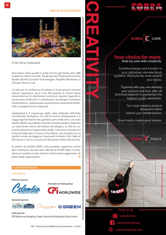 ARTICOLI IN CALCESTRUZZOC&PI %u2013 Calcestruzzo & Prefabbricazione International %u2013 5 | 2025blocchiere d%u2019alta qualit%u00e0 in India che ha gi%u00e0 fornito oltre 400 impianti in tutto il mondo. Tra gli sponsor Diamond troviamo Apollo Zenith Concrete Technologies, Parijatha Machinery e Q Green Techon Ltd.La sala per la conferenza di settore si trova proprio accanto all%u2019area espositiva, dove circa 50 aziende di diversi Paesi presenteranno le ultimissime novit%u00e0 per quanto riguarda la produzione di blocchi in calcestruzzo, tecnologie e soluzioni ultramoderne. I partecipanti acquisiranno conoscenze trasferibili a progetti locali e regionali.Hyderabad %u00e8 il capoluogo dello stato federale dell%u2019India meridionale Telangana. La citt%u00e0 ha buoni collegamenti e si raggiunge facilmente da qualsiasi parte della terra, con volo diretto dall%u2019Europa, Medio Oriente e Sudest asiatico. Essendo un importante centro del settore tecnologico, la citt%u00e0 ha numerosi ristoranti e negozi d%u2019alto livello. I siti storici includono il Forte di Golkonda e l%u2019iconico Char Minar, una moschea le cui quattro arcate sorreggono imponenti minareti, che risale al XVI secolo e che %u00e8 un punto di riferimento della citt%u00e0 vecchia.A partire da ottobre 2025 sar%u00e0 possibile registrarsi online alla conferenza. Sul sito web ufficiale di ICCBP https://iccbp.pbma.in/ potete trovare ulteriori informazioni aggiornate da parte degli organizzatori. nALTRE INFORMAZIONIwww.iccbp.orgPlatinum sponsorDiamond sponsorsGold sponsorsKBT Machineries Bengaluru | Sagar Cements Ltd Hyderabad | Kobra FormenInternational media partnerIl Char Minar, HyderabadFind us atCREATIVITYwww.kobragroup.comkobraformengroupkobraformenYour choice for more.Side by side with creativity.Combine design and function in your individual concrete block systems. We build the mold around your stone.Together with you, we develop your product and look after all technical aspects to guarantee the highest quality standards.Our most creative product designers stand behind your constructions.Good molds create good stones.
