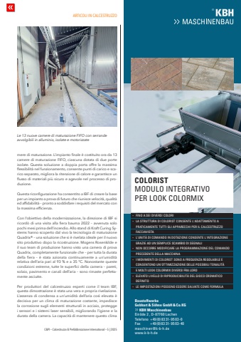 ARTICOLI IN CALCESTRUZZOC&PI %u2013 Calcestruzzo & Prefabbricazione International %u2013 5 | 2025mere di maturazione. L%u2019impianto finale %u00e8 costituito ora da 13 camere di maturazione FIFO, ciascuna dotata di due porte isolate. Questa soluzione a doppia porta offre la massima flessibilit%u00e0 nel funzionamento, consente punti di carico e scarico separato, migliora la ritenzione di calore e garantisce un flusso di materiali pi%u00f9 sicuro e agevole nel processo di produzione.Questa riconfigurazione ha consentito a IBF di creare la base per un impianto a prova di futuro che riunisce velocit%u00e0, qualit%u00e0 ed affidabilit%u00e0 %u2013 pronto a soddisfare i requisiti del mercato con la massima efficienza.Con l%u2019obiettivo della modernizzazione, la direzione di IBF si ricord%u00f2 di una visita alla fiera bauma 2022 %u2013 avvenuta solo pochi mesi prima dell%u2019incendio. Allo stand di Kraft Curing Systems hanno scoperto dal vivo la tecnologia di maturazione Quadrix%u00ae %u2013 una soluzione che si %u00e8 rivelata ideale per il nuovo sito produttivo dopo la ricostruzione. Mogens Rosenkilde e il suo team di produzione hanno visto una camera di prova Quadrix, completamente funzionale che %u2013 per tutta la durata della fiera %u2013 %u00e8 stata azionata continuamente a un%u2019umidit%u00e0 relativa dell%u2019aria pari al 93 % e a 35 %u00b0C. Nonostante queste condizioni estreme, tutte le superfici della camera %u2013 pareti, solaio, pavimento e canali dell%u2019aria %u2013 sono rimaste perfettamente asciutte.Per produttori del calcestruzzo esperti come il team IBF, questa dimostrazione %u00e8 stata una vera e propria rivelazione. L%u2019assenza di condensa a un%u2019umidit%u00e0 dell%u2019aria cos%u00ec elevata %u00e8 decisiva per un clima di maturazione costante, impedisce la corrosione sugli elementi strutturali in acciaio, protegge i sensori e i sistemi laser sensibili, migliorando l%u2019igiene e la durata della camera. La capacit%u00e0 di mantenere questo clima Le 13 nuove camere di maturazione FIFO con serrande avvolgibili in alluminio, isolate e motorizzate%u00b7 FINO A SEI DIVERSI COLORI%u00b7 LA STRUTTURA DI COLORIST CONSENTE L'ADATTAMENTO A PRATICAMENTE TUTTI GLI APPARECCHI PER IL CALCESTRUZZO FACCIAVISTA%u00b7 L'UNIT%u00c0 DI COMANDO IN DOTAZIONE CONSENTE L'INTEGRAZIONE GRAZIE AD UN SEMPLICE SCAMBIO DI SEGNALI%u00b7 NON OCCORRE MODIFICARE LA PROGRAMMAZIONE DEL COMANDO PRECEDENTE DELLA MACCHINA%u00b7 I MOVIMENTI DI COLORIST SONO A FREQUENZA REGOLABILE E CONSENTONO UN'OTTIMIZZAZIONE DELLE POSSIBILI TONALIT%u00c0 E MOLTI LOOK COLORMIX DIVERSI FRA LORO%u00b7 ELEVATO LIVELLO DI RIPRODUCIBILIT%u00c0 DEL GIOCO CROMATICO DEFINITO%u00b7 LE IMPOSTAZIONI POSSONO ESSERE SALVATE COME FORMULA%u00aeCOLORIST MODULO INTEGRATIVO PER LOOK COLORMIXBaustoffwerke Gebhart & S%u00f6hne GmbH & Co. KG KBH MaschinenbauEin%u00f6de 2 , D-87760 LachenTelefono +49 (0) 83 31- 95 03-0Fax +49 (0) 83 31- 95 03-40maschinen@k-b-h.dewww.k-b-h.de