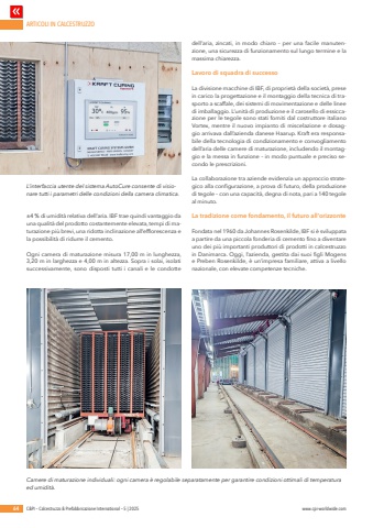 ARTICOLI IN CALCESTRUZZO64 C&PI %u2013 Calcestruzzo & Prefabbricazione International %u2013 5 | 2025 www.cpi-worldwide.com%u00b14 % di umidit%u00e0 relativa dell%u2019aria. IBF trae quindi vantaggio da una qualit%u00e0 del prodotto costantemente elevata, tempi di maturazione pi%u00f9 brevi, una ridotta inclinazione all%u2019efflorescenza e la possibilit%u00e0 di ridurre il cemento.Ogni camera di maturazione misura 17,00 m in lunghezza, 3,20 m in larghezza e 4,00 m in altezza. Sopra i solai, isolati successivamente, sono disposti tutti i canali e le condotte dell%u2019aria, zincati, in modo chiaro %u2013 per una facile manutenzione, una sicurezza di funzionamento sul lungo termine e la massima chiarezza.Lavoro di squadra di successoLa divisione macchine di IBF, di propriet%u00e0 della societ%u00e0, prese in carico la progettazione e il montaggio della tecnica di trasporto a scaffale, dei sistemi di movimentazione e delle linee di imballaggio. L%u2019unit%u00e0 di produzione e il carosello di essiccazione per le tegole sono stati forniti dal costruttore italiano Vortex, mentre il nuovo impianto di miscelazione e dosaggio arrivava dall%u2019azienda danese Haarup. Kraft era responsabile della tecnologia di condizionamento e convogliamento dell%u2019aria delle camere di maturazione, includendo il montaggio e la messa in funzione %u2013 in modo puntuale e preciso secondo le prescrizioni.La collaborazione tra aziende evidenzia un approccio strategico alla configurazione, a prova di futuro, della produzione di tegole %u2013 con una capacit%u00e0, degna di nota, pari a 140 tegole al minuto.La tradizione come fondamento, il futuro all%u2019orizzonteFondata nel 1960 da Johannes Rosenkilde, IBF si %u00e8 sviluppata a partire da una piccola fonderia di cemento fino a diventare uno dei pi%u00f9 importanti produttori di prodotti in calcestruzzo in Danimarca. Oggi, l%u2019azienda, gestita dai suoi figli Mogens e Preben Rosenkilde, %u00e8 un%u2019impresa familiare, attiva a livello nazionale, con elevate competenze tecniche.L%u2019interfaccia utente del sistema AutoCure consente di visionare tutti i parametri delle condizioni della camera climatica.Camere di maturazione individuali: ogni camera %u00e8 regolabile separatamente per garantire condizioni ottimali di temperatura ed umidit%u00e0.