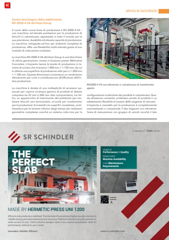 ARTICOLI IN CALCESTRUZZOwww.cpi-worldwide.com C&PI %u2013 Calcestruzzo & Prefabbricazione International %u2013 5 | 2025 67Centro tecnologico dello stabilimento: RH 2000-4 VA del Hess GroupIl cuore della nuova linea di produzione %u00e8 RH 2000-4 VA %u2013 una macchina ad elevate prestazioni per la produzione di blocchi in calcestruzzo, apprezzata in tutto il mondo per la sua precisione, durabilit%u00e0 ed elevata capacit%u00e0 di produzione. La macchina, sviluppata ad hoc per ambienti complessi di produzione, offre una flessibilit%u00e0 molto elevata grazie al suo metodo di costruzione modulare.La macchina RH 2000-4 VA del Hess Group %u00e8 una blocchiera di ultima generazione, messa in funzione presso Mehramat Concretes. L%u2019impianto lavora le tavole di produzione in lamiera di acciaio che misurano 1.400 mm %u00d7 1.150 mm, da cui si ottiene una superficie di produzione utile pari a 1.300 mm %u00d7 1.100 mm. Queste dimensioni consentono un rendimento elevamento per ciclo e contribuiscono all%u2019efficienza dell%u2019intera produzione.La macchina %u00e8 dotata di una molteplicit%u00e0 di accessori opzionali per coprire un%u2019ampia gamma di prodotti di altezza compresa tra 25 mm e 500 mm. Essi comprendono, tra l%u2019altro, un apparecchio di inserimento del polistirolo per realizzare blocchi cavi termoisolati, un%u2019unit%u00e0 per rivestimento per la produzione di masselli con superfici complesse, un%u2019attrezzatura per le lamiere inferiori degli stampi per realizzare geometrie complesse nonch%u00e9 un sistema color-mix per la configurazione multicolore dei prodotti in calcestruzzo. Questa dotazione consente un%u2019elevata variet%u00e0 di prodotti e un adattamento flessibile al mutare delle esigenze di mercato.L%u2019impianto a carosello per la produzione %u00e8 completamente automatizzato e comprende il lato bagnato con elevatore, l%u2019area di maturazione con gruppo di veicoli nonch%u00e9 il lato RH2000-4 VA con elemento in calcestruzzo di rivestimento apertowww.sr-schindler.comEffi cient slab production redefi ned: The Hermetic Press delivers highest quality standards,reliable dosing, precisest tolerances and accuracy. Patented solutions simplify operations,while access to over 1,500 exclusive designs opens new creative possibilities. Built for performance, tailored to your needs.Innovative. Reliable. Effi cient.HighestPerformance & QualityMaximizedMachine AvailabilityLow MaintenanceRequirementsTHEPERFECTSLABMADE BY HERMETIC PRESS UNI 1200Downloadbrochures