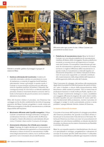 ARTICOLI IN CALCESTRUZZO74 C&PI %u2013 Calcestruzzo & Prefabbricazione International %u2013 5 | 2025 www.cpi-worldwide.com%u2022 Gestione ottimizzata del movimento: il sistema di controllo cinematico calcola con precisione le curve di traslazione e consente di aggirare bordi fastidiosi ottimizzando i tempi e gli strappi. In questo modo, il Cuboter si muove sempre sul percorso pi%u00f9 efficiente verso le rispettive posizioni di prelievo o deposito. Ne conseguono tempi di ciclo brevi e un%u2019elevata stabilit%u00e0 di processo. Grazie ai movimenti dinamici armonici del Cuboter, la formazione dei pacchi avviene con la massima attenzione al prodotto.Oltre alle funzioni relative al processo, ora Cleannox trae vantaggio anche da altre caratteristiche tecniche di equipaggiamento del Masa Cuboter progettate in modo mirato per l%u2019efficienza energetica, la facilit%u00e0 di manutenzione e un%u2019elevata disponibilit%u00e0 dell%u2019impianto:%u2022 Movimento efficiente sotto il profilo energetico: il Masa Cuboter convertendo l%u2019energia di frenata in energia di accelerazione fornisce un elevato livello di efficienza energetica. Grazie alla selezione automatizzata del percorso, il Cuboter riduce anche il consumo di energia.%u2022 Azionamento silenzioso che richiede poca manutenzione: l%u2019impiego di cinghie dentate per il meccanismo di traslazione e sollevamento garantisce un funzionamento silenzioso e riduce al minimo la manutenzione. A differenza degli azionamenti a catena, non si verificano allungamenti e non %u00e8 necessaria alcuna lubrificazione.%u2022 Piattaforma di manutenzione sicura: Masa ha fornito il Cuboter con una robusta piattaforma di manutenzione installata all%u2019altezza della carreggiata. Questa piattaforma consente un accesso sicuro ed ergonomico ai componenti del Cuboter. Ci%u00f2 semplifica notevolmente gli interventi di manutenzione e ispezione, aumenta la sicurezza sul lavoro e migliora l%u2019efficienza della manutenzione. In questo modo, le manutenzioni a intervalli regolari e il rilevamento tempestivo con relativa risoluzione di fenomeni di usura sono supportati: un notevole contributo alla massimizzazione della disponibilit%u00e0 dell%u2019impianto e all%u2019allungamento della vita utile del Cuboter.Tutto il processo di cubaggio, dal prelievo allo spostamento degli strati di prodotti fino alla formazione dei pacchi di blocchi: tutto %u00e8 studiato a misura della temporizzazione della blocchiera e della variet%u00e0 di prodotti. %u201cOra la nostra linea di produzione funziona in modo molto pi%u00f9 fluido, rapido e continuo. Questo investimento strategico ci aiuta a soddisfare con maggiore efficienza le esigenze dei nostri clienti. Inoltre, la nostra squadra ora pu%u00f2 concentrarsi di nuovo sulle funzioni fondamentali della produzione, mentre il processo di cubaggio si svolge in modo automatizzato, preciso e senza problemi%u201d, spiega Aldredo Cebri%u00e1n, titolare di Cleannox.La nuova visione di sicurezzaIl concetto di sicurezza dell%u2019impianto di cubaggio precedente alla Cleannox prevedeva che quando si accedeva all%u2019area rilevante per la sicurezza tutto il lato del secco si fermasse. Pertanto per Cleannox era chiara una cosa: la nuova soluzione di cubaggio non solo doveva soddisfare un elevato standard di sicurezza, ma doveva anche essere chiaramente pi%u00f9 flessibile e orientata alla prassi.Masa ha una squadra esperta e interdisciplinare che da anni si %u00e8 specializzata in sviluppo, progettazione e attuazione di concept di sicurezza specifici delle blocchiere. Il collaudato concept di sicurezza Masa suddivide ogni impianto in diverse Potente e versatile: gabbia di pinzaggio e gruppo di rotazione MasaEfficiente sotto ogni punto di vista: il Masa Cuboter con possibilit%u00e0 di accesso sicuro