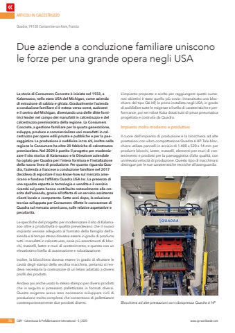 ARTICOLI IN CALCESTRUZZO76 C&PI %u2013 Calcestruzzo & Prefabbricazione International %u2013 5 | 2025 www.cpi-worldwide.comLa storia di Consumers Concrete %u00e8 iniziata nel 1933, a Kalamazoo, nello stato USA del Michigan, come azienda di estrazione di sabbia e ghiaia. Gradualmente l%u2019azienda a conduzione familiare si %u00e8 estesa verso ovest, sudovest e il centro del Michigan, diventando una delle ditte fornitrici leader nel campo dei manufatti in calcestruzzo e del calcestruzzo premiscelato della regione. La Consumers Concrete, a gestione familiare per la quarta generazione, sviluppa, produce e commercializza vari manufatti in calcestruzzo per opere edili private e pubbliche e per la paesaggistica. La produzione %u00e8 suddivisa in tre siti, inoltre nella regione la Consumers ha oltre 20 fabbriche di calcestruzzo premiscelato. Nel 2024 %u00e8 partito il progetto per modernizzare il sito storico di Kalamazoo e la Direzione aziendale ha optato per Quadra per l%u2019intera fornitura e l%u2019installazione della nuova linea di produzione. Per quanto riguarda Quadra, l%u2019azienda a francese a conduzione familiare nel 2017 decideva di esportare il suo know-how sul mercato americano e fondava l%u2019affiliata Quadra USA Inc. La presenza di una squadra esperta in tecnologia e vendite e il servizio ricambi sul posto hanno contribuito notevolmente alla crescita dell%u2019azienda, grazie all%u2019offerta di un servizio assistenza clienti locale e competente. Sette anni dopo, la soluzione tecnica sviluppata per Consumers riflette le conoscenze di Quadra sul mercato americano, sulle relative aspettative e peculiarit%u00e0.Le specifiche del progetto per modernizzare il sito di Kalamazoo oltre a produttivit%u00e0 e qualit%u00e0 prevedevano che il nuovo impianto venisse adeguato al formato della famiglia dell%u2019azienda e al tempo stesso dovesse essere in grado di produrre tutti i manufatti in calcestruzzo, ossia pi%u00f9 assortimenti di blocchi, masselli, lastre e muri di contenimento, e questo con un elevatissimo livello di automazione e robotizzazione.Inoltre, la blocchiera doveva essere in grado di sfruttare le cavit%u00e0 degli stampi della vecchia macchina, pertanto si rendeva necessaria la costruzione di un telaio adattato a diversi profili dei prodotti.Andava poi anche usato lo stesso stampo per diversi prodotti che in seguito si potessero pallettizzare in formati diversi. Questa esigenza aveva reso necessario sviluppare cicli di produzione molto complessi che consentono di pallettizzare contemporaneamente due prodotti diversi.L%u2019impianto proposto e scelto per raggiungere questi numerosi obiettivi %u00e8 stato quello pi%u00f9 ovvio: innanzitutto una blocchiera del tipo Q6 HP, la prima installata negli USA, in grado di soddisfare tutte le esigenze a livello di caratteristiche e performance, poi sei robot Kuka dotati tutti di pinza pneumatica progettata e costruita da Quadra.Impianto molto moderno e produttivoIl cuore dell%u2019impianto di produzione %u00e8 la blocchiera ad alte prestazioni con vibro-compattazione Quadra 6 HP. Tale blocchiera utilizza pannelli in acciaio di 1.400 x 520 x 14 mm per produrre blocchi, lastre, masselli, elementi per muri di contenimento e prodotti per la paesaggistica d%u2019alta qualit%u00e0, con un%u2019elevata velocit%u00e0 di produzione. Questo tipo di macchina si distingue per le sue caratteristiche tecniche all%u2019avanguardia.Due aziende a conduzione familiare uniscono le forze per una grande opera negli USAQuadra, 74130 Contamine-sur-Arve, FranciaBlocchiera ad alte prestazioni con vibropressa Quadra 6 HP