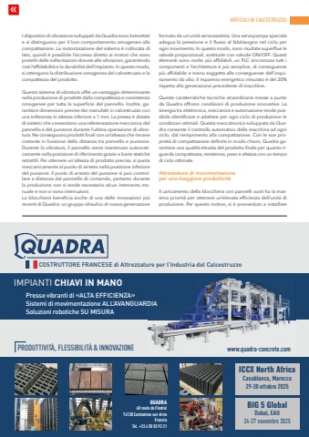 ARTICOLI IN CALCESTRUZZOwww.cpi-worldwide.com C&PI %u2013 Calcestruzzo & Prefabbricazione International %u2013 5 | 2025 77I dispositivi di vibrazione sviluppati da Quadra sono brevettati e si distinguono per il loro comportamento omogeneo alla compattazione. La motorizzazione del sistema %u00e8 collocata di lato, quindi %u00e8 possibile l%u2019accesso diretto ai motori che sono protetti dalle sollecitazioni dovute alle vibrazioni, garantendo cos%u00ec l%u2019affidabilit%u00e0 e la durabilit%u00e0 dell%u2019impianto. In questo modo, si ottengono la distribuzione omogenea del calcestruzzo e la compattezza del prodotto.Questo sistema di vibratura offre un vantaggio determinante nella produzione di prodotti dalla compattezza e consistenza omogenee per tutta la superficie del pannello. Inoltre, garantisce dimensioni precise dei manufatti in calcestruzzo con una tolleranza in altezza inferiore a 1 mm. La pressa %u00e8 dotata di sistemi che consentono una referenzazione meccanica del pannello e del punzone durante l%u2019ultima operazione di vibratura. Ne conseguono prodotti finali con un%u2019altezza che rimane costante in funzione della distanza tra pannello e punzone. Durante la vibratura, il pannello viene mantenuto automaticamente nella posizione di riferimento grazie a barre statiche retrattili. Per ottenere un'altezza di prodotto precisa, si punta meccanicamente al punto di arresto nella posizione inferiore del punzone. Il punto di arresto del punzone si pu%u00f2 controllare a distanza dal pannello di comando, pertanto durante la produzione non si rende necessario alcun intervento manuale e non vi sono interruzioni.La blocchiera beneficia anche di una delle innovazioni pi%u00f9 recenti di Quadra: un gruppo idraulico di nuova generazione formato da un%u2019unit%u00e0 servoassistita. Una servopompa speciale adegua la pressione e il flusso al fabbisogno nel ciclo per ogni movimento. In questo modo, sono risultate superflue le valvole proporzionali, sostituite con valvole ON/OFF. Questi elementi sono molto pi%u00f9 affidabili, un PLC sincronizza tutti i componenti e l%u2019architettura %u00e8 pi%u00f9 semplice, di conseguenza pi%u00f9 affidabile e meno soggetta alle conseguenze dell%u2019inquinamento da olio. Il risparmio energetico misurato %u00e8 del 20% rispetto alla generazione precedente di macchine.Queste caratteristiche tecniche straordinarie messe a punto da Quadra offrono condizioni di produzione innovative. La sinergia tra elettronica, meccanica e automazione rende possibile identificare e adattare per ogni ciclo di produzione le condizioni ottimali. Questa meccatronica sviluppata da Quadra consente il controllo automatico della macchina ad ogni ciclo, dal riempimento alla compattazione. Con le sue propriet%u00e0 di compattazione definite in modo chiaro, Quadra garantisce una qualit%u00e0 elevata del prodotto finale per quanto riguarda compattezza, resistenza, peso e altezza con un tempo di ciclo ottimale.Attrezzature di movimentazione per una maggiore produttivit%u00e0Il caricamento della blocchiera con pannelli vuoti ha la massima priorit%u00e0 per ottenere un%u2019elevata efficienza dell%u2019unit%u00e0 di produzione. Per questo motivo, si %u00e8 provveduto a installare PRODUTTIVIT%u00c0, FLESSIBILIT%u00c0 & INNOVAZIONECOSTRUTTORE FRANCESE di Attrezzature per l%u2019Industria del CalcestruzzoIMPIANTI CHIAVI IN MANOPresse vibranti di %u00abALTA EFFICIENZA%u00bbSistemi di movimentazione ALL%u2019AVANGUARDIASoluzioni robotiche SU MISURAQUADRA40 route de Findrol 74130 Contamine-sur-Arve FranciaTel. +33 4 50 03 92 21 www.quadra-concrete.comICCX North AfricaCasablanca, Marocco29-30 ottobre 2025BIG 5 GlobalDubai, EAU24-27 novembre 2025