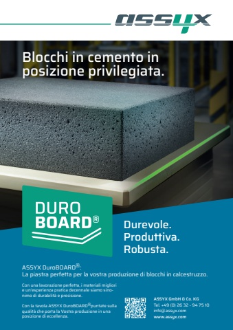 Durevole. Produttiva. Robusta.ASSYX GmbH & Co. KGTel. +49 (0) 26 32 - 94 75 10info@assyx.comwww.assyx.comCon una lavorazione perfetta, i materiali migliori e un%u2019esperienza pratica decennale siamo sinonimo di durabilit%u00e0 e precisione.Con la tavola ASSYX DuroBOARD%u00aepuntate sulla qualit%u00e0 che porta la Vostra produzione in una posizione di eccellenza.ASSYX DuroBOARD%u00ae: La piastra perfetta per la vostra produzione di blocchi in calcestruzzo.Blocchi in cemento in posizione privilegiata.