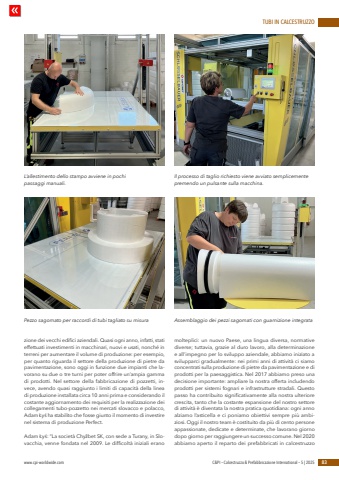 TUBI IN CALCESTRUZZOwww.cpi-worldwide.com C&PI %u2013 Calcestruzzo & Prefabbricazione International %u2013 5 | 2025 83zione dei vecchi edifici aziendali. Quasi ogni anno, infatti, stati effettuati investimenti in macchinari, nuovi e usati, nonch%u00e9 in terreni per aumentare il volume di produzione: per esempio, per quanto riguarda il settore della produzione di pietre da pavimentazione, sono oggi in funzione due impianti che lavorano su due o tre turni per poter offrire un%u2019ampia gamma di prodotti. Nel settore della fabbricazione di pozzetti, invece, avendo quasi raggiunto i limiti di capacit%u00e0 della linea di produzione installata circa 10 anni prima e considerando il costante aggiornamento dei requisiti per la realizzazione dei collegamenti tubo-pozzetto nei mercati slovacco e polacco, Adam %u0141y%u015b ha stabilito che fosse giunto il momento di investire nel sistema di produzione Perfect.Adam %u0141y%u015b: %u201cLa societ%u00e0 Chy%u017ebet SK, con sede a Turany, in Slovacchia, venne fondata nel 2009. Le difficolt%u00e0 iniziali erano molteplici: un nuovo Paese, una lingua diversa, normative diverse; tuttavia, grazie al duro lavoro, alla determinazione e all%u2019impegno per lo sviluppo aziendale, abbiamo iniziato a svilupparci gradualmente: nei primi anni di attivit%u00e0 ci siamo concentrati sulla produzione di pietre da pavimentazione e di prodotti per la paesaggistica. Nel 2017 abbiamo preso una decisione importante: ampliare la nostra offerta includendo prodotti per sistemi fognari e infrastrutture stradali. Questo passo ha contribuito significativamente alla nostra ulteriore crescita, tanto che la costante espansione del nostro settore di attivit%u00e0 %u00e8 diventata la nostra pratica quotidiana: ogni anno alziamo l%u2019asticella e ci poniamo obiettivi sempre pi%u00f9 ambiziosi. Oggi il nostro team %u00e8 costituito da pi%u00f9 di cento persone appassionate, dedicate e determinate, che lavorano giorno dopo giorno per raggiungere un successo comune. Nel 2020 abbiamo aperto il reparto dei prefabbricati in calcestruzzo L%u2019allestimento dello stampo avviene in pochi passaggi manuali.Pezzo sagomato per raccordi di tubi tagliato su misuraIl processo di taglio richiesto viene avviato semplicemente premendo un pulsante sulla macchina.Assemblaggio dei pezzi sagomati con guarnizione integrata