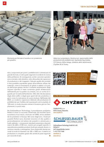 TUBI IN CALCESTRUZZOwww.cpi-worldwide.com C&PI %u2013 Calcestruzzo & Prefabbricazione International %u2013 5 | 2025 87stica, componenti per ponti o prefabbricati in calcestruzzo di grande formato, in tutti questi segmenti %u00e8 evidente la ricerca della perfezione. Di conseguenza, anche i processi operativi sono orientati a tale obiettivo: oltre alla pulizia dei capannoni di produzione e dei magazzini, l%u2019elevata qualit%u00e0 dei prodotti %u00e8 resa possibile soprattutto grazie all%u2019eccellente utilizzo dei materiali, come la lavorazione di ghiaia e sabbia o la pulizia dell%u2019acqua grezza. Anche il costante ampliamento degli impianti operativi %u00e8 stato consentito grazie all%u2019attenzione dell%u2019azienda per la qualit%u00e0 e la crescita, con un occhio di riguardo per la tutela dell%u2019ambiente. Oltre alla ristrutturazione degli ultimi edifici e degli spazi aperti del sito produttivo, %u00e8 gi%u00e0 in corso la costruzione di nuove strutture. Nell%u2019estate del 2025, un moderno capannone dedicato alla produzione di prefabbricati per l%u2019edilizia del soprassuolo verr%u00e0 ampliato di 100 metri, in modo da poter entrare in funzione, gi%u00e0 con l%u2019ampliamento, in pochi mesi.Per Schl%u00fcsselbauer Technology, il procedimento produttivo Perfect %u00e8 ormai un successo ventennale. Gi%u00e0 durante l%u2019anno successivo al suo lancio, avvenuto nel 2004, venne adottato da tre produttori in Europa. Nel corso degli anni, i fondi per pozzetti Perfect sono diventati sinonimo di alta qualit%u00e0 e personalizzazione nel settore dei pozzetti in calcestruzzo a livello globale: i componenti standard presentano diametri interni da 600 a 2100 mm, mentre per progetti specifici %u00e8 naturalmente possibile produrre fondi per pozzetti diversi, in versione rotonda o rettangolare. Sono disponibili stampi per canali di scolo di diametro da 100 a 1000 mm. Il sistema di produzione %u00e8 completo grazie alla variet%u00e0 di pezzi sagomati per raccordi di tubi. nALTRE INFORMAZIONIChy%u017ebet SK SK, s.r.o.038 53 Turany, Slovacchiawww.chyzbet.skSchl%u00fcsselbauer Technology GmbH & Co KG H%u00f6rbach 44673 Gaspoltshofen, Austria T +43 7735 71440 sbm@sbm.atwww.sbm.atElemento per fermata di autobus con protezione per gradinoAdam %u0141y%u015b, proprietario; Karolina %u0141y%u015b, responsabile della produzione dei prefabbricati; Agnieszka Spychalska, CPi Polonia; Milos Salaga, direttore dello stabilimento Chy%u017ebet SK di Turany%u00a9 Chy%u017ebet SKSchl%u00fcsselbauer ha sponsorizzato la possibilit%u00e0 di scaricare gratuitamente il pdf di questo articolo per tutti i lettori di CuPI. Vi preghiamo di verificare il sito web www.cpi-worldwide.com/it/channels/schluesselbauer oppure di fare la scansione del codice QR con il Vostro smartphone per avere accesso diretto a questo sito web.