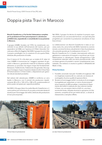 ELEMENTI PREFABBRICATI IN CALCESTRUZZO88 C&PI %u2013 Calcestruzzo & Prefabbricazione International %u2013 5 | 2025 www.cpi-worldwide.comBianchi Casseforme s.r.l ha fornito l%u2019attrezzatura completa per la produzione di Travi precompresse in calcestruzzo prefabbricato, espandendo e consolidando la sua presenza in Marocco.Il gruppo HAMRI, fondato nel 1993, ha inizialmente concentrato la sua attivit%u00e0 nell'estrazione del marmo, per poi espandersi nel 2006 con l'apertura di 3 filiali: Granulati, Calcestruzzo e Blocchi (Agglos). Nel 2020, il gruppo ha arricchito il proprio portafoglio con la creazione di una quarta filiale, dedicata alla produzione di malte. Con 2 riserve di 15 e 26 ettari per un totale di 41 ettari di cave, HAMRI %u00e8 riconosciuta tra i maggiori operatori di granulati in Marocco, garantendo materiali di altissima qualit%u00e0 attraverso un processo che segue cinque fasi fondamentali: Estrazione, Trasferimento, Trattamento dei granulati, Stoccaggio e Consegna. Il parco impianti %u00e8 dotato di oltre 5 linee fisse di frantumazione e 3 linee mobili, a disposizione per garantire elevati standard produttivi.Nel settore del calcestruzzo, HAMRI si conferma un vero leader in Marocco, con 3 centrali che producono rispettivamente 80 m%u00b3/h e 120 m%u00b3/h a 180 m%u00b3/h, posizionandosi al primo posto nel paese per capacit%u00e0 produttiva.Nel 2023, il Gruppo Hamri ha scelto Bianchi Casseforme s.r.l. come partner per la fornitura di una pista universale dotata di struttura per l%u2019ancoraggio dei trefoli, dedicata alla produzione di travi precompresse.Nel 2024, il gruppo ha deciso di ampliare la propria capacit%u00e0 produttiva con una seconda fornitura: una speciale pista progettata per consentire la produzione simultanea di due linee di travi.La collaborazione con Bianchi Casseforme %u00e8 stata un successo, tanto che, verso la fine del 2024, l%u2019azienda ha commissionato una terza fornitura, attualmente in fase di produzione, che prevede sponde per la realizzazione di travi a \Bianchi Casseforme S.r.l. %u00e8 leader internazionale nella progettazione e costruzione di impianti e macchinari per la prefabbricazione in calcestruzzo. Grazie all'esperienza e alle competenze maturate nella sua storia pluridecennale, offre un'ampia gamma di prodotti e servizi completamente automatizzati, che mettono in mostra la qualit%u00e0 e l'affidabilit%u00e0 del Made in Italy.Prima fornitura:1. Fondello universale manuale: Fondello di lunghezza 100 m e larghezza massima 60 cm, costruito con lamiera di controgetto di prima qualit%u00e0 di spessore 8mm.2. Struttura di ancoraggio trefoli: La struttura di ancoraggio %u00e8 progettata per supportare un carico di precompressione massimo di 600 tonnellate. L'estremit%u00e0 di rilassamento dei trefoli %u00e8 costituita da: due colonne inserite in fosse, con uno spazio interno di 60 cm, una trave scorrevole forata, utilizzata durante le operazioni di rilassamento, completa di fori per trefoli da 0,6\rilassamento a semplice effetto. Doppia pista Travi in MaroccoBianchi Precast Group, 43045 Fornovo di Taro (PR), ItaliaPrima linea di produzione Le due linee di produzione