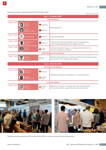 WWW.ICCX.ORGwww.cpi-worldwide.com C&PI %u2013 Calcestruzzo & Prefabbricazione International %u2013 5 | 2025 9Programma della conferenza dell%u2019ICCX North Africa 2025 Stato come da 26. 08. 2025Quest%u2019anno sar%u00e0 presente all%u2019ICCX North Africa 2025 un numero record di circa 60 espositori.Day 1 %u2013 29 October 2025 Opening Session10:00 - 10:10 Holger KarutzAmine Ma%u00e4chi-HaddouGermanyMoroccoOpening speech10:10 - 10:20 LafargeHolcim Morocco Sponsor presentation10:30 - 11:00 Mouatassim Charai Morocco Transforming industrial by-products into CO2-sequestering, phase-change aggregates for net-negative concrete11:00 - 11:30 Amany Arafa Egypt AAC experiences from Egypt %u2013 an example of the beneficial use of AAC in north african countriesSeismic Design and Construction13:30 - 15:00 Stefano Pampanin Italy Workshop: Next generation of precast concrete low-damage structures: opportunities in the mediterranean regionsDay 2 %u2013 30 October 2025Admixtures and Additives10:00 - 11:00 Wolfram Schmidt GermayWorkshop: admixtures and additives in concrete productionAngela Tetteh TawiahSwitzerlandConcrete Products13:30 - 15:00 J%u00fcrgen OecknickSwitzerlandWorkshop: The balance of quality and costs in the production of concrete products %u2013 experiences from the plant practice