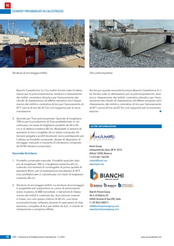 ELEMENTI PREFABBRICATI IN CALCESTRUZZO90 C&PI %u2013 Calcestruzzo & Prefabbricazione International %u2013 5 | 2025 www.cpi-worldwide.comBianchi Casseforme S.r.l ha inoltre fornito tutte le attrezzature per la precompressione, tesatura e rilassamento dei trefoli: centralina idraulica per l%u2019azionamento dei cilindri di rilassamento ad effetto semplice ed il rilassamento dei trefoli e centralina di tiro per l%u2019azionamento di N%u00b01 Lancia di tiro da 25 Ton con supporto per la movimentazione.3. Sponde per Travi precompresse: Sponde di lunghezza 100 m per la produzione di Travi prefabbricate in calcestruzzo con base di larghezza variabile da 20 a 60 cm e di altezza massima 80 cm. Realizzate in lamiera di spessore 6 mm e irrigidite da un telaio composto da lamiere piegate e profili strutturali, sono predisposte per l%u2018utilizzo su fondello universale, dotate di dispositivi di serraggio manuale e impianto di vibrazione composto da N%u00b040 vibratori pneumatici.Seconda fornitura:1. Fondello universale manuale: Fondello speciale doppio di lunghezza 100 m e larghezza massima 60 cm, costruito con lamiera di controgetto di prima qualit%u00e0 di spessore 8mm, per la realizzazione simultanea di N%u00b02 travi prefabbricate in calcestruzzo con base di larghezza massima 40 cm. 2. Struttura di ancoraggio trefoli: La struttura di ancoraggio %u00e8 progettata per supportare un carico di precompressione massimo di 800 tonnellate. L'estremit%u00e0 di rilassamento dei trefoli %u00e8 costituita da: due colonne inserite in fosse, con uno spazio interno di 40 cm, una trave scorrevole forata, utilizzata durante le operazioni di rilassamento, completa di fori per trefoli da 0,6\rilassamento a semplice effetto.Anche per questa seconda fornitura Bianchi Casseforme S.r.l ha fornito tutte le attrezzature per la precompressione, tesatura e rilassamento dei trefoli: centralina idraulica per l%u2019azionamento dei cilindri di rilassamento ad effetto semplice ed il rilassamento dei trefoli e centralina di tiro per l%u2019azionamento di N%u00b01 Lancia di tiro da 25 Ton con supporto per la movimentazione. nALTRE INFORMAZIONIHamri GroupLahouamed des Zears, BP N' 4374,Skhirat 12050, MaroccoT +212 661 165748contact@hamri.mawww.hamri.maBianchi Precast GroupVia G. Di Vittorio, 4243045 Fornovo di Taro (PR), ItaliaT +39 0525 400511info@bianchiprecastgroup.comwww.bianchiprecastgroup.comStruttura di ancoraggio trefoli Travi precompresse