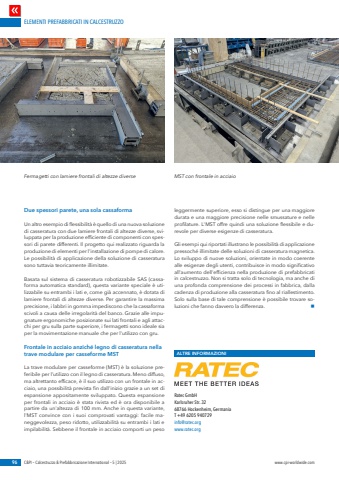 ELEMENTI PREFABBRICATI IN CALCESTRUZZO96 C&PI %u2013 Calcestruzzo & Prefabbricazione International %u2013 5 | 2025 www.cpi-worldwide.comDue spessori parete, una sola cassaformaUn altro esempio di flessibilit%u00e0 %u00e8 quello di una nuova soluzione di casseratura con due lamiere frontali di altezze diverse, sviluppata per la produzione efficiente di componenti con spessori di parete differenti. Il progetto qui realizzato riguarda la produzione di elementi per l'installazione di pompe di calore. Le possibilit%u00e0 di applicazione della soluzione di casseratura sono tuttavia teoricamente illimitate.Basata sul sistema di casseratura robotizzabile SAS (cassaforma automatica standard), questa variante speciale %u00e8 utilizzabile su entrambi i lati e, come gi%u00e0 accennato, %u00e8 dotata di lamiere frontali di altezze diverse. Per garantire la massima precisione, i labbri in gomma impediscono che la cassaforma scivoli a causa delle irregolarit%u00e0 del banco. Grazie alle impugnature ergonomiche posizionate sui lati frontali e agli attacchi per gru sulla parte superiore, i fermagetti sono ideale sia per la movimentazione manuale che per l'utilizzo con gru.Frontale in acciaio anzich%u00e9 legno di casseratura nella trave modulare per casseforme MSTLa trave modulare per casseforme (MST) %u00e8 la soluzione preferibile per l%u2019utilizzo con il legno di casseratura. Meno diffuso, ma altrettanto efficace, %u00e8 il suo utilizzo con un frontale in acciaio, una possibilit%u00e0 prevista fin dall'inizio grazie a un set di espansione appositamente sviluppato. Questa espansione per frontali in acciaio %u00e8 stata rivista ed %u00e8 ora disponibile a partire da un'altezza di 100 mm. Anche in questa variante, l'MST convince con i suoi comprovati vantaggi: facile maneggevolezza, peso ridotto, utilizzabilit%u00e0 su entrambi i lati e impilabilit%u00e0. Sebbene il frontale in acciaio comporti un peso leggermente superiore, esso si distingue per una maggiore durata e una maggiore precisione nelle smussature e nelle profilature. L'MST offre quindi una soluzione flessibile e durevole per diverse esigenze di casseratura. Gli esempi qui riportati illustrano le possibilit%u00e0 di applicazione pressoch%u00e9 illimitate delle soluzioni di casseratura magnetica. Lo sviluppo di nuove soluzioni, orientate in modo coerente alle esigenze degli utenti, contribuisce in modo significativo all'aumento dell'efficienza nella produzione di prefabbricati in calcestruzzo. Non si tratta solo di tecnologia, ma anche di una profonda comprensione dei processi in fabbrica, dalla cadenza di produzione alla casseratura fino al riallestimento. Solo sulla base di tale comprensione %u00e8 possibile trovare soluzioni che fanno davvero la differenza. nALTRE INFORMAZIONIRatec GmbH Karlsruher Str. 32 68766 Hockenheim, Germania T +49 6205 940729 info@ratec.org www.ratec.orgFermagetti con lamiere frontali di altezze diverse MST con frontale in acciaio