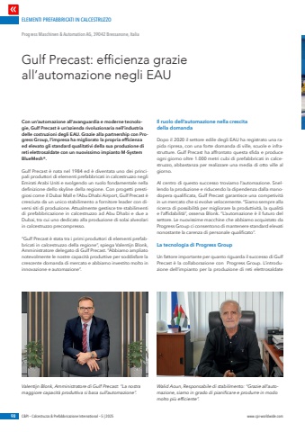 ELEMENTI PREFABBRICATI IN CALCESTRUZZO98 C&PI %u2013 Calcestruzzo & Prefabbricazione International %u2013 5 | 2025 www.cpi-worldwide.comCon un%u2019automazione all%u2019avanguardia e moderne tecnologie, Gulf Precast %u00e8 un%u2019azienda rivoluzionaria nell%u2019industria delle costruzioni degli EAU. Grazie alla partnership con Progress Group, l%u2019impresa ha migliorato la propria efficienza ed elevato gli standard qualitativi della sua produzione di reti elettrosaldate con un nuovissimo impianto M-System BlueMesh%u00ae.Gulf Precast %u00e8 nata nel 1984 ed %u00e8 diventata uno dei principali produttori di elementi prefabbricati in calcestruzzo negli Emirati Arabi Uniti e svolgendo un ruolo fondamentale nella definizione dello skyline della regione. Con progetti prestigiosi come il Dubai Mall e l%u2019Abu Dhabi Airport, Gulf Precast %u00e8 cresciuta da un unico stabilimento a fornitore leader con diversi siti di produzione. Attualmente gestisce tre stabilimenti di prefabbricazione in calcestruzzo ad Abu Dhabi e due a Dubai, tra cui uno dedicato alla produzione di solai alveolari in calcestruzzo precompresso.%u201cGulf Precast %u00e8 stata tra i primi produttori di elementi prefabbricati in calcestruzzo della regione%u201d, spiega Valentijn Blonk, Amministratore delegato di Gulf Precast. %u201cAbbiamo ampliato notevolmente le nostre capacit%u00e0 produttive per soddisfare la crescente domanda di mercato e abbiamo investito molto in innovazione e automazione%u201d.Il ruolo dell%u2019automazione nella crescita della domandaDopo il 2020 il settore edile degli EAU ha registrato una rapida ripresa, con una forte domanda di ville, scuole e infrastrutture. Gulf Precast ha affrontato questa sfida e produce ogni giorno oltre 1.000 metri cubi di prefabbricati in calcestruzzo, abbastanza per realizzare una media di otto ville al giorno.Al centro di questo successo troviamo l%u2019automazione. Snellendo la produzione e riducendo la dipendenza dalla manodopera qualificata, Gulf Precast garantisce una competivit%u00e0 in un mercato che si evolve velocemente. %u201cSiamo sempre alla ricerca di possibilit%u00e0 per migliorare la produttivit%u00e0, la qualit%u00e0 e l%u2019affidabilit%u00e0%u201d, osserva Blonk. %u201cL%u2019automazione %u00e8 il futuro del settore. Le nuovissime macchine che abbiamo acquistato da Progress Group ci consentono di mantenere standard elevati nonostante la carenza di personale qualificato%u201d.La tecnologia di Progress GroupUn fattore importante per quanto riguarda il successo di Gulf Precast %u00e8 la collaborazione con Progress Group. L%u2019introduzione dell%u2019impianto per la produzione di reti elettrosaldate Gulf Precast: efficienza grazie all%u2019automazione negli EAU Progress Maschinen & Automation AG, 39042 Bressanone, ItaliaValentijn Blonk, Amministratore di Gulf Precast: %u201cLa nostra maggiore capacit%u00e0 produttiva si basa sull%u2019automazione%u201d.Walid Aoun, Responsabile di stabilimento: %u201cGrazie all%u2019automazione, siamo in grado di pianificare e produrre in modo molto pi%u00f9 efficiente%u201d.