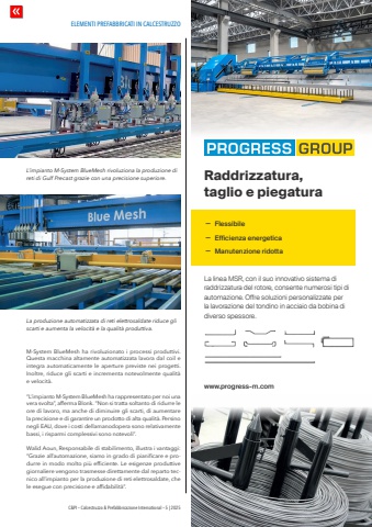 ELEMENTI PREFABBRICATI IN CALCESTRUZZOC&PI %u2013 Calcestruzzo & Prefabbricazione International %u2013 5 | 2025M-System BlueMesh ha rivoluzionato i processi produttivi. Questa macchina altamente automatizzata lavora dal coil e integra automaticamente le aperture previste nei progetti. Inoltre, riduce gli scarti e incrementa notevolmente qualit%u00e0 e velocit%u00e0.%u201cL%u2019impianto M-System BlueMesh ha rappresentato per noi una vera svolta%u201d, afferma Blonk. %u201cNon si tratta soltanto di ridurre le ore di lavoro, ma anche di diminuire gli scarti, di aumentare la precisione e di garantire un prodotto di alta qualit%u00e0. Persino negli EAU, dove i costi dellamanodopera sono relativamente bassi, i risparmi complessivi sono notevoli%u201d.Walid Aoun, Responsabile di stabilimento, illustra i vantaggi: %u201cGrazie all%u2019automazione, siamo in grado di pianificare e produrre in modo molto pi%u00f9 efficiente. Le esigenze produttive giornaliere vengono trasmesse direttamente dal reparto tecnico all%u2019impianto per la produzione di reti elettrosaldate, che le esegue con precisione e affidabilit%u00e0%u201d.L%u2019impianto M-System BlueMesh rivoluziona la produzione di reti di Gulf Precast grazie con una precisione superiore.La produzione automatizzata di reti elettrosaldate riduce gli scarti e aumenta la velocit%u00e0 e la qualit%u00e0 produttiva. Raddrizzatura, taglio e piegatura%u02db Flessibile%u02db Efficienza energetica%u02db Manutenzione ridottawww.progress-m.comLa linea MSR, con il suo innovativo sistema di raddrizzatura del rotore, consente numerosi tipi di automazione. Offre soluzioni personalizzate per la lavorazione del tondino in acciaio da bobina di diverso spessore.