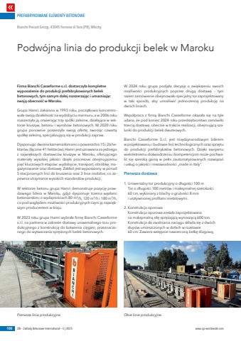 PREFABRYKOWANE ELEMENTY BETONOWE100 ZBI %u2013 Zak%u0142ady Betonowe International %u2013 5 | 2025 www.cpi-worldwide.comFirma Bianchi Casseforme s.r.l. dostarczy%u0142a kompletne wyposa%u017cenie do produkcji prefabrykowanych belek betonowych, tym samym dalej rozszerzaj%u0105c i umacniaj%u0105c swoj%u0105 obecno%u015b%u0107 w Maroku.Grupa Hamri, za%u0142o%u017cona w 1993 roku, pocz%u0105tkowo koncentrowa%u0142a swoj%u0105 dzia%u0142alno%u015b%u0107 na wydobyciu marmuru, a w 2006 roku rozszerzy%u0142a j%u0105, otwieraj%u0105c trzy sp%u00f3%u0142ki zale%u017cne, dzia%u0142aj%u0105ce w sektorze kruszyw, betonu i wyrob%u00f3w betonowych. W 2020 roku grupa ponownie poszerzy%u0142a swoj%u0105 ofert%u0119, tworz%u0105c czwart%u0105 sp%u00f3%u0142k%u0119 zale%u017cn%u0105, specjalizuj%u0105c%u0105 si%u0119 w produkcji zapraw.Dysponuj%u0105c dwoma kamienio%u0142omami o powierzchni 15 i 26 hektar%u00f3w, (%u0142%u0105cznie 41 hektar%u00f3w), Hamri jest uznawana za jednego z najwi%u0119kszych dostawc%u00f3w kruszyw w Maroku, oferuj%u0105cego materia%u0142y wysokiej jako%u015bci dzi%u0119ki procesowi obejmuj%u0105cemu pi%u0119%u0107 kluczowych etap%u00f3 wydobycie, transport, obr%u00f3bk%u0119, magazynowanie oraz dostaw%u0119. Zak%u0142ad jest wyposa%u017cony w ponad 5 stacjonarnych linii do kruszenia oraz 3 linie mobilne, co zapewnia utrzymanie wysokich standard%u00f3w produkcji.W sektorze betonu grupa Hamri demonstruje pozycj%u0119 prawdziwego lidera w Maroku, gdy%u017c dysponuje trzema w%u0119z%u0142ami betoniarskimi o wydajno%u015bciach 80 m3/h, 120 m3/h i 180 m3/h, co pod wzgl%u0119dem mo%u017cliwo%u015bci produkcyjnych czyni j%u0105 najwi%u0119kszym producentem w kraju.W 2023 roku grupa Hamri wybra%u0142a firm%u0119 Bianchi Casseforme s.r.l. na partnera w zakresie dostawy uniwersalnego toru produkcyjnego z konstrukcj%u0105 do kotwienia ci%u0119gien, przeznaczonego do wytwarzania spr%u0119%u017conych belek betonowych.W 2024 roku grupa podj%u0119%u0142a decyzj%u0119 o zwi%u0119kszeniu swoich mo%u017cliwo%u015bci produkcyjnych poprzez drug%u0105 dostaw%u0119 %u2013 tym razem zam%u00f3wienie obejmowa%u0142o specjalny tor zaprojektowany w taki spos%u00f3b, aby umo%u017cliwi%u0107 jednoczesn%u0105 produkcj%u0119 na dw%u00f3ch liniach.Wsp%u00f3%u0142praca z firm%u0105 Bianchi Casseforme okaza%u0142a si%u0119 na tyle udana, %u017ce pod koniec 2024 roku przedsi%u0119biorstwo zam%u00f3wi%u0142o trzeci%u0105 dostaw%u0119, obecnie w trakcie realizacji, obejmuj%u0105c%u0105 szalunki do produkcji belek dwuteowych.Bianchi Casseforme S.r.l. jest mi%u0119dzynarodowym liderem w projektowaniu i budowie linii technologicznych oraz sprz%u0119tu do produkcji prefabrykat%u00f3w betonowych. Dzi%u0119ki swojemu wieloletniemu do%u015bwiadczeniu i kompetencjom mo%u017ce pochwali%u0107 si%u0119 szerok%u0105 gam%u0105 w pe%u0142ni zautomatyzowanych rozwi%u0105za%u0144 i us%u0142ug o jako%u015bci i niezawodno%u015bci %u201emade in Italy%u201d. Pierwsza dostawa1. Uniwersalny tor produkcyjny o d%u0142ugo%u015bci 100 mTor o d%u0142ugo%u015bci 100 metr%u00f3w i maksymalnej szeroko%u015bci 60 cm, wykonany z blachy o grubo%u015bci 8 mm i usztywnionej profilami metalowymi.2. Konstrukcja oporowaKonstrukcja oporowa zosta%u0142a zaprojektowana na maksymaln%u0105 si%u0142%u0119 spr%u0119%u017caj%u0105c%u0105 wynosz%u0105c%u0105 600 ton. Konstrukcja do zwalniania naci%u0105gu sk%u0142ada si%u0119 z dw%u00f3ch s%u0142up%u00f3w umieszczonych w do%u0142ach w rozstawie 60 cm. Zawiera wst%u0119pnie nawiercon%u0105 belk%u0119 %u015blizgow%u0105, Podw%u00f3jna linia do produkcji belek w MarokuBianchi Precast Group, 43045 Fornovo di Taro (PR), W%u0142ochyPierwsza linia produkcyjna. Obie linie produkcyjne.