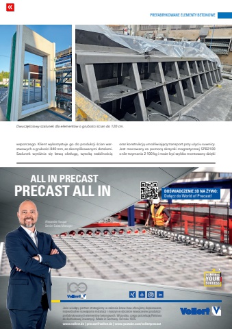PREFABRYKOWANE ELEMENTY BETONOWEwww.cpi-worldwide.com%u0009 ZBI %u2013 Zak%u0142ady Betonowe International %u2013 5 | 2025 105wsporczego. Klient wykorzystuje go do produkcji %u015bcian warstwowych o grubo%u015bci 840 mm, ze skomplikowanymi detalami. Szalunek wyr%u00f3%u017cnia si%u0119 %u0142atw%u0105 obs%u0142ug%u0105, wysok%u0105 stabilno%u015bci%u0105 oraz konstrukcj%u0105 umo%u017cliwiaj%u0105c%u0105 transport przy u%u017cyciu suwnicy. Jest mocowany za pomoc%u0105 skrzynki magnetycznej SPB2100 o sile trzymania 2 100 kg i mo%u017ce by%u0107 szybko montowany dzi%u0119ki Dwucz%u0119%u015bciowy szalunek dla element%u00f3w o grubo%u015bci %u015bcian do 120 cm.DO%u015aWIADCZENIE 3D NA %u017bYWO: Do%u0142%u0105cz do World of Precast!Jako wiod%u0105cy partner strategiczny w zakresie know-how oferujemy dopasowane, indywidualne rozwi%u0105zania instalacji i maszyn w obszarze nowoczesnej produkcji prefabrykowanych element%u00f3w betonowych. Wszystko, czego potrzebuj%u0105 Pa%u0144stwo do dochodowej inwestycji. Made in Germany. Od roku 1925.www.vollert.de | precast@vollert.de | www.youtube.com/vollertprecast ALL IN PRECASTPRECAST ALL INAlexander KasparSenior Sales Manager