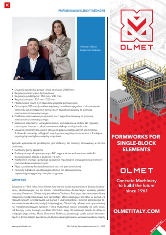 PREFABRYKOWANE ELEMENTY BETONOWEwww.cpi-worldwide.com%u0009 ZBI %u2013 Zak%u0142ady Betonowe International %u2013 5 | 2025%u2022 D%u0142ugo%u015b%u0107 spocznika: prawa i lewa strona po 2 000 mm%u2022 Regulacja elektryczno-hydrauliczna%u2022 Regulacja podstopnic: 150 mm / 200 mm%u2022 Regulacja stopni: 220 mm / 320 mm%u2022 P%u0142aska %u015bciana mo%u017ce by%u0107 otwierana poprzez przesuni%u0119cie.%u2022 Odsuni%u0119cie 700 mm (mo%u017cliwe wi%u0119ksze), umo%u017cliwia wygodne rozformowanie elementu oraz czyszczenie formy. Ruch zsynchronizowany za pomoc%u0105 mechanizmu kinematycznego.%u2022 Pod%u0142u%u017cne przesuwanie po szynach, ruch zsynchronizowany za pomoc%u0105 mechanizmu kinematycznego.%u2022 %u015aciana ze stopniami i uchwytami stopni, wyposa%u017cona w zestaw do regulacji podstopnic i stopni %u2013 ca%u0142o%u015b%u0107 sterowana elektryczno-hydraulicznie.%u2022 Si%u0142owniki elektrohydrauliczne steruj%u0105 regulacj%u0105 nast%u0119puj%u0105cych element%u00f3 2 si%u0142owniki ustawiaj%u0105 odleg%u0142o%u015b%u0107 mi%u0119dzy poszczeg%u00f3lnymi stopniami, a 2 kolejne reguluj%u0105 k%u0105t nachylenia mi%u0119dzy stopniami.Spos%u00f3b wyko%u0144czenia podstopnic jest zbli%u017cony do metody stosowanej w formie poziomej.%u2022 Ruchomy g%u00f3rny spocznik%u2022 Podstopnice pod k%u0105tem prostym 90%u00b0, wyposa%u017cone w drewniane wk%u0142adki do mocowania sklejki o grubo%u015bci 18 mm.%u2022 Nachylenie lewego i prawego spocznika regulowane jest za pomoc%u0105 r%u0119cznych podno%u015bnik%u00f3w mechanicznych.%u2022 P%u0142yta u podstawy formy (drewniane dno nie jest konieczne)%u2022 Pomosty z drabin%u0105 umo%u017cliwiaj%u0105c%u0105 dost%u0119p do stalowej formy, zapewniaj%u0105ce wygodn%u0105 i bezpieczn%u0105 prac%u0119.Olmet ItalyZa%u0142o%u017cona w 1961 roku firma Olmet Italy stawia czo%u0142a wyzwaniom w bran%u017cy budowlanej, dostosowuj%u0105c si%u0119 do zmian i konsekwentnie dostarczaj%u0105c wysokiej jako%u015bci maszyny. Prezesem Olmet Italy jest Alberto Tedesco. Pod jego kierownictwem firma rozwin%u0119%u0142a mi%u0119dzynarodow%u0105 sie%u0107 sprzeda%u017cy, kt%u00f3ra obs%u0142uguje klient%u00f3w w ponad 70 r%u00f3%u017cnych krajach i zrealizowa%u0142a ju%u017c ponad 1 300 projekt%u00f3w. Pomimo g%u0142%u0119bokiego zakorzenienia we w%u0142oskiej tradycji in%u017cynieryjnej, Olmet Italy odnosi znacz%u0105ce sukcesy na mi%u0119dzynarodowych rynkach. Firma eksportuje swoje produkty na ca%u0142y %u015bwiat, od Europy i obu Ameryk po Bliski Wsch%u00f3d i Azj%u0119. W ostatnich latach do Alberto do%u0142%u0105czy%u0142a jego c%u00f3rka, Maria Giovanna Tedesco, przejmuj%u0105c cz%u0119%u015b%u0107 zada%u0144 kierowniczych w firmie. Dzi%u0119ki %u015bwie%u017cemu podej%u015bciu i zaanga%u017cowaniu w zr%u00f3wnowa%u017cony rozw%u00f3j Alberto i Maria Giovanna Tedesco.OLMETITALY.COMFORMWORKS FOR SINGLE-BLOCKELEMENTSMADE IN ITALY