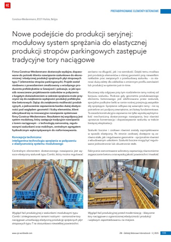 PREFABRYKOWANE ELEMENTY BETONOWEwww.cpi-worldwide.com%u0009 ZBI %u2013 Zak%u0142ady Betonowe International %u2013 5 | 2025 111Firma Construx-Weckenmann dostarczy%u0142a wydajne, dopasowane do potrzeb klienta rozwi%u0105zanie szalunkowe do ekonomicznej i elastycznej produkcji spr%u0119%u017conych p%u0142yt stropowych typu T (element%u00f3w strop%u00f3w parkingowych). Projekt zosta%u0142 niedawno z powodzeniem zrealizowany u wiod%u0105cego producenta prefabrykat%u00f3w w Szwajcarii i pokazuje, w jaki spos%u00f3b nowoczesne projektowanie szalunk%u00f3w w po%u0142%u0105czeniu z bogatym do%u015bwiadczeniem w zakresie spr%u0119%u017cania mo%u017ce przyczyni%u0107 si%u0119 do zwi%u0119kszenia wydajno%u015bci produkcji prefabrykat%u00f3w betonowych. D%u0105%u017c%u0105c do zwi%u0119kszenia mo%u017cliwo%u015bci produkcyjnych, a jednocze%u015bnie zapewnienia bardzo du%u017cej elastyczno%u015bci pod wzgl%u0119dem geometrii i liczby element%u00f3w, klient zdecydowa%u0142 si%u0119 na innowacyjne rozwi%u0105zanie systemowe firmy Construx-Weckenmann. Rezultatem tej wsp%u00f3%u0142pracy jest system modu%u0142owy, kt%u00f3ry zast%u0119puje tradycyjne rozwi%u0105zania z torem naci%u0105gowym %u2013 z technologi%u0105 samono%u015bn%u0105, regulowanymi szalunkami oraz mobilnym, centralnym agregatem hydraulicznym wykorzystywanym do rozformowywania.Koncepcja techniczna: inteligentna technologia spr%u0119%u017cania w po%u0142%u0105czeniu z elastyczno%u015bci%u0105 systemu modu%u0142owegoCentralnym elementem dostarczonego rozwi%u0105zania jest wysoce elastyczny szalunek typu Combi, kt%u00f3ry mo%u017cna regulowa%u0107 zar%u00f3wno na d%u0142ugo%u015b%u0107, jak i na szeroko%u015b%u0107. Dzi%u0119ki temu mo%u017cliwa jest produkcja element%u00f3w o r%u00f3%u017cnej geometrii przy niewielkim nak%u0142adzie prac zwi%u0105zanych z przebudow%u0105 szalunku %u2013 co stanowi du%u017c%u0105 zalet%u0119 dla zak%u0142ad%u00f3w o zmiennym profilu zam%u00f3wie%u0144 lub produkcji w systemie just-in-time.Kluczow%u0105 rol%u0119 odgrywa przy tym rozdzielenie ramy no%u015bnej od korpusu szalunku. Podczas gdy geometria produkowanego elementu betonowego jest zdefiniowana przez szalunek, specjalne pod%u0142u%u017cne belki w ramie no%u015bnej przejmuj%u0105 wszystkie si%u0142y spr%u0119%u017caj%u0105ce. Spr%u0119%u017canie odbywa si%u0119 wewn%u0105trz ramy %u2013 nie s%u0105 potrzebne ani podpory zewn%u0119trzne, ani kotwy fundamentowe. Ta zasada konstrukcyjna zapewnia nie tylko wysok%u0105 wytrzyma%u0142o%u015b%u0107 mechaniczn%u0105 dostarczonego rozwi%u0105zania, lecz r%u00f3wnie%u017c upraszcza konserwacj%u0119 i dopasowywanie szalunku w trakcie bie%u017c%u0105cej eksploatacji.Szalunki boczne i czo%u0142owe r%u00f3wnie%u017c zosta%u0142y zaprojektowane w spos%u00f3b elastyczny. Po stronie czo%u0142owej dost%u0119pne s%u0105 zar%u00f3wno sta%u0142e, jak i regulowane geometrie %u2013 opcjonalnie r%u00f3wnie%u017c z wbudowanym uskokiem. Szalunki boczne mog%u0105 by%u0107 regulowane jednostronnie lub obustronnie sta%u0142e.Fabrycznie zamontowane wibratory zapewniaj%u0105 r%u00f3wnomierne zag%u0119szczanie betonu oraz wysok%u0105 jako%u015b%u0107 powierzchni i trwa%u0142o%u015b%u0107 Nowe podej%u015bcie do produkcji seryjnej: modu%u0142owy system spr%u0119%u017cania do elastycznej produkcji strop%u00f3w parkingowych zast%u0119puje tradycyjne tory naci%u0105goweConstrux-Weckenmann, 8531 Hulste, BelgiaWygl%u0105d hali produkcyjnej z szalunkami modu%u0142owymi typu Combi i zintegrowanymi ramami no%u015bnymi %u2013 samono%u015bne tory naci%u0105gowe umo%u017cliwiaj%u0105 elastyczn%u0105 produkcj%u0119 spr%u0119%u017conych p%u0142yt stropowych typu T na stosunkowo niewielkiej powierzchni.Wygl%u0105d hali produkcyjnej przed modernizacj%u0105 %u2013 klasyczne tory naci%u0105gowe o ograniczonej elastyczno%u015bci produkcji i wi%u0119kszym zapotrzebowaniu na miejsce.