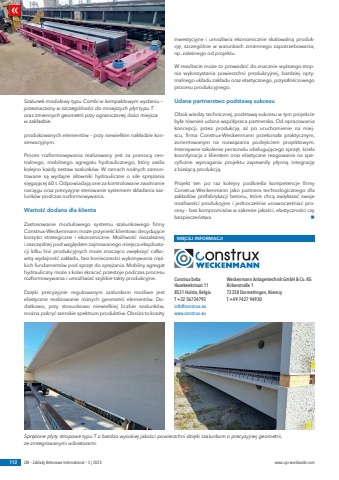 PREFABRYKOWANE ELEMENTY BETONOWE112 ZBI %u2013 Zak%u0142ady Betonowe International %u2013 5 | 2025 www.cpi-worldwide.comprodukowanych element%u00f3w %u2013 przy niewielkim nak%u0142adzie konserwacyjnym.Proces rozformowywania realizowany jest za pomoc%u0105 centralnego, mobilnego agregatu hydraulicznego, kt%u00f3ry zasila kolejno ka%u017cdy zestaw szalunk%u00f3w. W ramach no%u015bnych zamontowane s%u0105 wydajne si%u0142owniki hydrauliczne o sile spr%u0119%u017cania si%u0119gaj%u0105cej 60 t. Odpowiadaj%u0105 one za kontrolowane zwalnianie naci%u0105gu oraz precyzyjne sterowanie systemem sk%u0142adania szalunk%u00f3w podczas rozformowywania. Warto%u015b%u0107 dodana dla klientaZastosowanie modu%u0142owego systemu szalunkowego firmy Construx-Weckenmann mo%u017ce przynie%u015b%u0107 klientowi decyduj%u0105ce korzy%u015bci strategiczne i ekonomiczne. Mo%u017cliwo%u015b%u0107 niezale%u017cnej i oszcz%u0119dnej pod wzgl%u0119dem zajmowanego miejsca eksploatacji kilku linii produkcyjnych mo%u017ce znacz%u0105co zwi%u0119kszy%u0107 ca%u0142kowit%u0105 wydajno%u015b%u0107 zak%u0142adu, bez konieczno%u015bci wykonywania ci%u0119%u017ckich fundament%u00f3w pod sprz%u0119t do spr%u0119%u017cania. Mobilny agregat hydrauliczny mo%u017ce z kolei skraca%u0107 przestoje podczas procesu rozformowywania i umo%u017cliwia%u0107 szybkie takty produkcyjne.Dzi%u0119ki precyzyjnie regulowanym szalunkom mo%u017cliwe jest elastyczne realizowanie r%u00f3%u017cnych geometrii element%u00f3w. Dodatkowo, przy stosunkowo niewielkiej liczbie szalunk%u00f3w, mo%u017cna pokry%u0107 szerokie spektrum produkt%u00f3w. Obni%u017ca to koszty inwestycyjne i umo%u017cliwia ekonomicznie skalowaln%u0105 produkcj%u0119, szczeg%u00f3lnie w warunkach zmiennego zapotrzebowania, np. zale%u017cnego od projektu.W rezultacie mo%u017ce to prowadzi%u0107 do znacznie wy%u017cszego stopnia wykorzystania powierzchni produkcyjnej, bardziej optymalnego uk%u0142adu zak%u0142adu oraz elastycznego, przysz%u0142o%u015bciowego procesu produkcyjnego.Udane partnerstwo podstaw%u0105 sukcesuObok wiedzy technicznej, podstaw%u0105 sukcesu w tym projekcie by%u0142a r%u00f3wnie%u017c udana wsp%u00f3%u0142praca partnerska. Od opracowania koncepcji, przez produkcj%u0119, a%u017c po uruchomienie na miejscu, firma Construx-Weckenmann przekona%u0142a praktycznym, zorientowanym na rozwi%u0105zania podej%u015bciem projektowym. Intensywne szkolenie personelu obs%u0142uguj%u0105cego sprz%u0119t, %u015bcis%u0142a koordynacja z klientem oraz elastyczne reagowanie na specyficzne wymagania projektu zapewni%u0142y p%u0142ynn%u0105 integracj%u0119 z bie%u017c%u0105c%u0105 produkcj%u0105.Projekt ten po raz kolejny podkre%u015bla kompetencje firmy Construx-Weckenmann jako partnera technologicznego dla zak%u0142ad%u00f3w prefabrykacji betonu, kt%u00f3re chc%u0105 zwi%u0119ksza%u0107 swoje mo%u017cliwo%u015bci produkcyjne i jednocze%u015bnie unowocze%u015bnia%u0107 procesy %u2013 bez kompromis%u00f3w w zakresie jako%u015bci, elastyczno%u015bci czy bezpiecze%u0144stwa. nSzalunek modu%u0142owy typu Combi w kompaktowym wydaniu %u2013 przeznaczony w szczeg%u00f3lno%u015bci do mniejszych p%u0142yt typu T oraz zmiennych geometrii przy ograniczonej ilo%u015bci miejsca w zak%u0142adzie.WI%u0118CEJ INFORMACJIWeckenmann Anlagentechnik GmbH & Co. KG Birkenstra%u00dfe 1 72358 Dormettingen, NiemcyT +49 7427 94930 Construx bvba Hazebeekstraat 11 8531 Hulste, BelgiaT +32 56724793 info@construx.eu www.construx.eu Spr%u0119%u017cone p%u0142yty stropowe typu T o bardzo wysokiej jako%u015bci powierzchni dzi%u0119ki szalunkom o precyzyjnej geometrii, ze zintegrowanymi wibratorami.