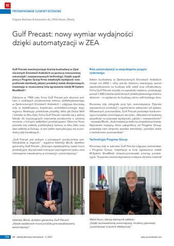 PREFABRYKOWANE ELEMENTY BETONOWE114 ZBI %u2013 Zak%u0142ady Betonowe International %u2013 5 | 2025 www.cpi-worldwide.comGulf Precast rewolucjonizuje bran%u017c%u0119 budowlan%u0105 w Zjednoczonych Emiratach Arabskich za pomoc%u0105 nowoczesnej automatyki i zaawansowanych technologii. Dzi%u0119ki wsp%u00f3%u0142pracy z Progress Group firma zwi%u0119kszy%u0142a wydajno%u015b%u0107 oraz podnios%u0142a standardy jako%u015bci produkcji siatek zbrojeniowych, inwestuj%u0105c w nowoczesn%u0105 lini%u0119 zgrzewania siatek M-System BlueMesh%u00ae.Za%u0142o%u017cona w 1984 roku firma Gulf Precast jest obecnie jednym z czo%u0142owych producent%u00f3w betonu prefabrykowanego w Zjednoczonych Emiratach Arabskich i odgrywa kluczow%u0105 rol%u0119 w kszta%u0142towaniu krajobrazu architektonicznego tego regionu. Realizuj%u0105c presti%u017cowe projekty, takie jak Dubai Mall i lotnisko w Abu Zabi, firma Gulf Precast rozros%u0142a si%u0119 z jednej fabryki do imponuj%u0105cych rozmiar%u00f3w producenta o uznanej renomie, z licznymi zak%u0142adami produkcyjnymi. Obecnie firma posiada trzy zak%u0142ady prefabrykacji betonu w Abu Zabi oraz dwa zak%u0142ady w Dubaju, w tym jeden specjalizuj%u0105cy si%u0119 w produkcji p%u0142yt kana%u0142owych.%u201eGulf Precast jest jednym z pierwszych producent%u00f3w prefabrykat%u00f3w w regionie%u201d %u2013 wyja%u015bnia Valentijn Blonk, dyrektor generalny Gulf Precast. %u201eZnacz%u0105co zwi%u0119kszyli%u015bmy nasze moce produkcyjne, aby sprosta%u0107 rosn%u0105cym wymaganiom rynku, oraz intensywnie inwestujemy w innowacje i automatyzacj%u0119.%u201dRola automatyzacji w zaspokajaniu popytu rynkowegoSektor budowlany w Zjednoczonych Emiratach Arabskich notuje od 2020 r. silny wzrost, kt%u00f3remu towarzyszy wzrost zapotrzebowania na budow%u0119 willi, szk%u00f3%u0142 oraz infrastruktury. Firma Gulf Precast stan%u0119%u0142a na wysoko%u015bci zadania, produkuj%u0105c ponad 1 000 metr%u00f3w sze%u015bciennych prefabrykowanego betonu dziennie %u2013 co wystarcza do budowy o%u015bmiu willi ka%u017cdego dnia.Kluczow%u0105 rol%u0119 odegra%u0142a przy tym automatyzacja. Poprzez usprawnienie produkcji i ograniczenie zale%u017cno%u015bci od wykwalifikowanych pracownik%u00f3w, Gulf Precast pozostaje konkurencyjna na szybko zmieniaj%u0105cym si%u0119 rynku. %u201eNieustannie szukamy sposob%u00f3w na popraw%u0119 wydajno%u015bci, jako%u015bci i niezawodno%u015bci%u201d %u2013 zauwa%u017ca Blonk. %u201eAutomatyzacja sta%u0142a si%u0119 przysz%u0142o%u015bci%u0105 bran%u017cy. Najnowsze maszyny, kt%u00f3re zakupili%u015bmy od Progress Group, pozwalaj%u0105 nam utrzyma%u0107 wysokie standardy i poradzi%u0107 sobie z niedoborem pracownik%u00f3w.%u201dTechnologia Progress GroupKluczow%u0105 rol%u0119 w sukcesie Gulf Precast odgrywa partnerstwo z Progress Group. Inwestycja w lini%u0119 zgrzewania siatek M-System BlueMesh zrewolucjonizowa%u0142a procesy produkcyjne. Ta wysoko zautomatyzowana maszyna obrabia materia%u0142 Gulf Precast: nowy wymiar wydajno%u015bci dzi%u0119ki automatyzacji w ZEAProgress Machines & Automation AG, 39042 Brixen, W%u0142ochyValentijn Blonk, dyrektor generalny Gulf Precast: %u201eNasze zwi%u0119kszone moce produkcyjne zawdzi%u0119czamy automatyzacji.%u201dWalid Aoun, starszy kierownik zak%u0142adu: %u201eDzi%u0119ki wprowadzonej automatyzacji mo%u017cemy planowa%u0107 i produkowa%u0107 znacznie efektywniej.%u201d