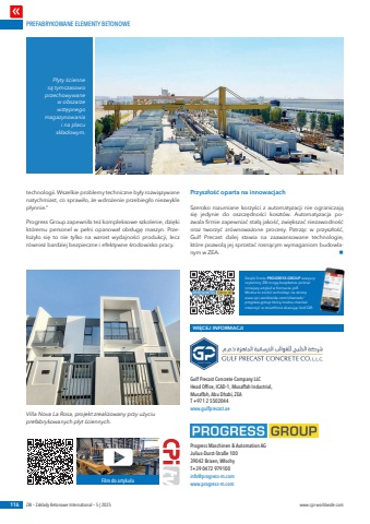 PREFABRYKOWANE ELEMENTY BETONOWE116 ZBI %u2013 Zak%u0142ady Betonowe International %u2013 5 | 2025 www.cpi-worldwide.comtechnologii. Wszelkie problemy techniczne by%u0142y rozwi%u0105zywane natychmiast, co sprawi%u0142o, %u017ce wdro%u017cenie przebieg%u0142o niezwykle p%u0142ynnie.%u201dProgress Group zapewni%u0142a te%u017c kompleksowe szkolenie, dzi%u0119ki kt%u00f3remu personel w pe%u0142ni opanowa%u0142 obs%u0142ug%u0119 maszyn. Prze%u0142o%u017cy%u0142o si%u0119 to nie tylko na wzrost wydajno%u015bci produkcji, lecz r%u00f3wnie%u017c bardziej bezpieczne i efektywne %u015brodowisko pracy.Przysz%u0142o%u015b%u0107 oparta na innowacjachSzeroko rozumiane korzy%u015bci z automatyzacji nie ograniczaj%u0105 si%u0119 jedynie do oszcz%u0119dno%u015bci koszt%u00f3w. Automatyzacja pozwala firmie zapewnia%u0107 sta%u0142%u0105 jako%u015b%u0107, zwi%u0119ksza%u0107 niezawodno%u015b%u0107 oraz tworzy%u0107 zr%u00f3wnowa%u017cone procesy. Patrz%u0105c w przysz%u0142o%u015b%u0107, Gulf Precast dalej stawia na zaawansowane technologie, kt%u00f3re pozwol%u0105 jej sprosta%u0107 rosn%u0105cym wymaganiom budowlanym w ZEA. nVilla Nova La Rosa, projekt zrealizowany przy u%u017cyciu prefabrykowanych p%u0142yt %u015bciennych.P%u0142yty %u015bcienne s%u0105 tymczasowo przechowywane w obszarze wst%u0119pnego magazynowania i na placu sk%u0142adowym.Film do artyku%u0142uWI%u0118CEJ INFORMACJIGulf Precast Concrete Company LLCHead Office, ICAD-1, Musaffah Industrial,Musaffah, Abu Dhabi, ZEAT +971 2 5502044www.gulfprecast.aeProgress Maschinen & Automation AG Julius-Durst-Stra%u00dfe 10039042 Brixen, W%u0142ochyT+39 0472 979100 info@progress-m.com www.progress-m.comDzi%u0119ki firmie PROGRESS GROUP wszyscy czytelnicy ZBI mog%u0105 bezp%u0142atnie pobra%u0107 niniejszy artyku%u0142 w formacie pdf. Mo%u017cna to zrobi%u0107 wchodz%u0105c na stron%u0119 www.cpi-worldwide.com/channels/progress-group kt%u00f3r%u0105 mo%u017cna r%u00f3wnie%u017c otworzy%u0107 w smartfonie skanuj%u0105c kod QR.