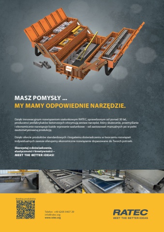 Telefon +49 6205 9407 29info@ratec.orgwww.ratec.orgKatalog produkt%u00f3wDzi%u0119ki innowacyjnym rozwi%u0105zaniom szalunkowym RATEC, sprawdzonym od ponad 30 lat, producenci prefabrykat%u00f3w betonowych otrzymuj%u0105 zestaw narz%u0119dzi, kt%u00f3ry skutecznie, przemy%u015blanie i ekonomicznie rozwi%u0105zuje ka%u017cde wyzwanie szalunkowe %u2013 od zastosowa%u0144 manualnych po w pe%u0142ni zautomatyzowan%u0105 produkcj%u0119.Dzi%u0119ki ofercie produkt%u00f3w standardowych i bogatemu do%u015bwiadczeniu w tworzeniu rozwi%u0105za%u0144 indywidualnych zawsze oferujemy ekonomiczne rozwi%u0105zanie dopasowane do Twoich potrzeb.Skorzystaj z do%u015bwiadczenia, elastyczno%u015bci i kreatywno%u015bci %u2013MEET THE BETTER IDEAS!MASZ POMYS%u0141Y ...MY MAMY ODPOWIEDNIE NARZ%u0118DZIE.