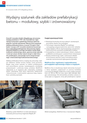 PREFABRYKOWANE ELEMENTY BETONOWE118 ZBI %u2013 Zak%u0142ady Betonowe International %u2013 5 | 2025 www.cpi-worldwide.comFirma B.T. innovation GmbH z Magdeburga od momentu swojego powstania w 1991 roku rozwin%u0119%u0142a si%u0119 z regionalnego hurtownika w globalnego dostawc%u0119 system%u00f3w po%u0142%u0105cze%u0144 i techniki szalunkowej. Obecnie firma zaopatruje zak%u0142ady prefabrykacji betonu w ponad 70 krajach. Dzia%u0142 bada%u0144 i rozwoju w B.T. innovation %u015bwiadomie koncentruje si%u0119 na optymalizacji ekologicznej i ekonomicznej. System szalowania MultiForm pomaga oszcz%u0119dza%u0107 zasoby dzi%u0119ki mo%u017cliwo%u015bci wielokrotnego u%u017cycia, ogranicza straty materia%u0142u i mo%u017ce tym samym obni%u017cy%u0107 zu%u017cycie energii w ca%u0142ym %u0142a%u0144cuchu produkcyjnym, przyczyniaj%u0105c si%u0119 do energooszcz%u0119dnego i zr%u00f3wnowa%u017conego budownictwa betonowego.Zak%u0142ady prefabrykacji betonu znajduj%u0105 si%u0119 pod presj%u0105: wi%u0119ksze ob%u0142o%u017cenie, kr%u00f3tsze terminy dostaw, mniej personelu. D%u0142ugie czasy zmian szalunku na sto%u0142ach produkcyjnych oraz pracoch%u0142onne procesy rozszalowywania zmniejszaj%u0105 przepustowo%u015b%u0107 i podnosz%u0105 koszty produkcji. MultiForm odpowiada na te wyzwania jako uniwersalny, modu%u0142owy system szalunkowy, kt%u00f3ry %u0142%u0105czy ergonomi%u0119, elastyczno%u015b%u0107 i ekonomiczno%u015b%u0107, a jednocze%u015bnie ogranicza straty materia%u0142owe i potrzeb%u0119 poprawek.Przegl%u0105d najwa%u017cniejszych funkcji%u2022 Modu%u0142owa konstrukcja do %u015bcian pe%u0142nych i warstwowych, spocznik%u00f3w, s%u0142up%u00f3w oraz podci%u0105g%u00f3w%u2022 Technologia magnes%u00f3w MagFly%u00ae do szybkiego i precyzyjnego pozycjonowania bez u%u017cycia %u015brub i wkr%u0119t%u00f3w%u2022 Listwa tr%u00f3jk%u0105tna z PE do natychmiastowego uszczelniania %u2013 brak konieczno%u015bci stosowania dodatkowych %u015brodk%u00f3w%u2022 Kompatybilny ze sto%u0142ami szalunkowymi, sto%u0142ami uchylnymi, podk%u0142adami produkcyjnymi i powierzchniami drewnianymi%u2022 Modu%u0142y wielokrotnego u%u017cytku i wielorazowe wk%u0142adki do formowania otwor%u00f3w i wci%u0119%u0107 minimalizuj%u0105 zu%u017cycie materia%u0142u oraz konieczno%u015b%u0107 wykonywania poprawek.MultiForm Duo: regulowany i zoptymalizowany pod wzgl%u0119dem zajmowanego miejsca w magazynieMultiForm Duo to kombinacja dw%u00f3ch element%u00f3w bocznych o r%u00f3%u017cnej wysoko%u015bci, po%u0142%u0105czonych za pomoc%u0105 %u015brodnik%u00f3w z mocowaniami MagFly. Dzi%u0119ki temu mo%u017cna uzyska%u0107 grubo%u015bci %u015bcian od 100 do 350 mm przy u%u017cyciu tylko jednego d%u017awigara szalunkowego. Dla kierownik%u00f3w produkcji oznacza to: mniej cz%u0119%u015bci w magazynie, mniej cykli przezbrajania i szybsze Wydajny szalunek dla zak%u0142ad%u00f3w prefabrykacji betonu %u2013 modu%u0142owy, szybki i zr%u00f3wnowa%u017conyB.T. innovation GmbH, 39116 Magdeburg, NiemcyModu%u0142owy system MultiForm na stole szalunkowym mocowany jest za pomoc%u0105 magnes%u00f3w MagFly AP.Widok szczeg%u00f3%u0142owy: MultiForm Duo z mocowaniami MagFly.