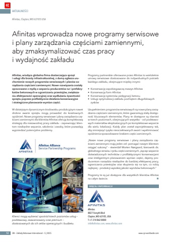 AKTUALNO%u015aCI12 ZBI %u2013 Zak%u0142ady Betonowe International %u2013 5 | 2025 www.cpi-worldwide.comAfinitas, wiod%u0105ca globalna firma dostarczaj%u0105ca sprz%u0119t i us%u0142ugi dla bran%u017cy infrastrukturalnej, z dum%u0105 og%u0142asza uruchomienie nowych program%u00f3w serwisowych i plan%u00f3w zarz%u0105dzania cz%u0119%u015bciami zamiennymi. Nowe rozwi%u0105zania zosta%u0142y opracowane z my%u015bl%u0105 o wsparciu producent%u00f3w rur i prefabrykat%u00f3w betonowych w ograniczaniu przestoj%u00f3w, zwi%u0119kszaniu efektywno%u015bci operacyjnej oraz wyd%u0142u%u017caniu %u017cywotno%u015bci sprz%u0119tu poprzez profilaktyczne dzia%u0142ania konserwacyjne i strategiczne planowanie wymian cz%u0119%u015bci.W dzisiejszym dynamicznym %u015brodowisku produkcyjnym nawet drobne awarie sprz%u0119tu mog%u0105 prowadzi%u0107 do kosztownych op%u00f3%u017anie%u0144. Nowe programy serwisowe i plany zarz%u0105dzania cz%u0119%u015bciami zamiennymi dla klient%u00f3w Afinitas oferuj%u0105 kompleksow%u0105 strategi%u0119 dla niezawodnej pracy zak%u0142adu %u2013 zapewniaj%u0105c klientom niezb%u0119dne wsparcie, szkolenia i zasoby, kt%u00f3re pozwalaj%u0105 wyprzedza%u0107 potencjalne problemy.Programy partnerskie oferowane przez Afinitas to wieloletnie umowy serwisowe dostosowane do indywidualnych potrzeb ka%u017cdego zak%u0142adu, obejmuj%u0105ce mi%u0119dzy innymi:%u2022 Konserwacj%u0119 zapobiegawcz%u0105 maszyn Afinitas%u2022 Konserwacj%u0119 form Afinitas%u2022 Konserwacj%u0119 system%u00f3w piel%u0119gnacji betonu%u2022 Us%u0142ugi optymalizacji zak%u0142adu pod k%u0105tem d%u0142ugofalowych zysk%u00f3wUzupe%u0142nieniem program%u00f3w serwisowych s%u0105 nowe plany zarz%u0105dzania cz%u0119%u015bciami zamiennymi, kt%u00f3re gwarantuj%u0105 sta%u0142%u0105 dost%u0119pno%u015b%u0107 kluczowych element%u00f3w. Plany te dost%u0119pne s%u0105 r%u00f3wnie%u017c w trzech poziomach, obejmuj%u0105cych wszystko %u2013 od podstawowych materia%u0142%u00f3w eksploatacyjnych po kompleksowe wsparcie dla wielu lokalizacji. Ka%u017cdy plan zosta%u0142 zaprojektowany tak, aby zmniejszy%u0107 ryzyko nieoczekiwanych awarii i wyeliminowa%u0107 op%u00f3%u017anienia spowodowane brakiem cz%u0119%u015bci zamiennych.%u201eNasze nowe programy serwisowe i plany zarz%u0105dzania cz%u0119%u015bciami zamiennymi maj%u0105 jeden cel: pomaga%u0107 naszym klientom osi%u0105ga%u0107 sukcesy%u201d %u2013 stwierdzi%u0142 Morten N%u00f8rgaard, kierownik ds. globalnego serwisu i rynku cz%u0119%u015bci zamiennych. %u201e%u0141%u0105cz%u0105c wsparcie do%u015bwiadczonych technik%u00f3w z profilaktycznymi konserwacjami oraz inteligentnym planowaniem wymian cz%u0119%u015bci, dajemy producentom narz%u0119dzia niezb%u0119dne do bardziej efektywnej pracy, ograniczania przestoj%u00f3w oraz skupienia si%u0119 na tym, co robi%u0105 najlepiej %u2013 produkcji wysokiej jako%u015bci wyrob%u00f3w betonowych.%u201dProgramy te s%u0105 ju%u017c dost%u0119pne dla wszystkich klient%u00f3w Afinitas na ca%u0142ym %u015bwiecie. nAfinitas wprowadza nowe programy serwisowe i plany zarz%u0105dzania cz%u0119%u015bciami zamiennymi, aby zmaksymalizowa%u0107 czas pracy i wydajno%u015b%u0107 zak%u0142aduAfinitas, Clayton, MO 63105 USAKlienci mog%u0105 wybiera%u0107 spo%u015br%u00f3d trzech poziom%u00f3w us%u0142ug %u2013 podstawowy, zaawansowany oraz premium %u2013 dostosowanych do ich cel%u00f3w operacyjnych i bud%u017cetu.WI%u0118CEJ INFORMACJIAfinitas8027 Forsyth BlvdClayton, MO 63105, USAT +1 314 862 8000info@afinitas.com, www.afinitas.com