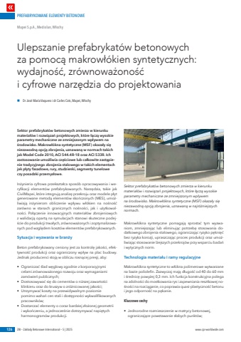 PREFABRYKOWANE ELEMENTY BETONOWE126 ZBI %u2013 Zak%u0142ady Betonowe International %u2013 5 | 2025 www.cpi-worldwide.comSektor prefabrykat%u00f3w betonowych zmierza w kierunku materia%u0142%u00f3w i rozwi%u0105za%u0144 projektowych, kt%u00f3re %u0142%u0105cz%u0105 wysokie parametry mechaniczne ze zmniejszonym wp%u0142ywem na %u015brodowisko. Makrow%u0142%u00f3kna syntetyczne (MSF) okaza%u0142y si%u0119 niezawodn%u0105 opcj%u0105 zbrojenia, uznawan%u0105 w normach takich jak Model Code 2010, ACI 544.4R-18 oraz ACI 533R. Ich zastosowanie umo%u017cliwia cz%u0119%u015bciowe lub ca%u0142kowite zast%u0105pienie tradycyjnego zbrojenia stalowego w takich elementach jak p%u0142yty fasadowe, rury, studzienki, segmenty tunelowe czy posadzki przemys%u0142owe.In%u017cynieria cyfrowa przekszta%u0142ca spos%u00f3b opracowywania i weryfikacji element%u00f3w prefabrykowanych. Narz%u0119dzia, takie jak CivilMapei, kt%u00f3re integruj%u0105 analiz%u0119 przekroju oraz modele p%u0142yt generowane metod%u0105 element%u00f3w sko%u0144czonych (MES), umo%u017cliwiaj%u0105 in%u017cynierom obliczenie wp%u0142ywu w%u0142%u00f3kien na no%u015bno%u015b%u0107 zar%u00f3wno w stanach granicznych no%u015bno%u015bci, jak i u%u017cytkowalno%u015bci. Po%u0142%u0105czenie innowacyjnych materia%u0142%u00f3w zbrojeniowych z walidacj%u0105 opart%u0105 na symulacjach stanowi skuteczne podej%u015bcie do produkcji trwa%u0142ych, zr%u00f3wnowa%u017conych i zoptymalizowanych pod wzgl%u0119dem koszt%u00f3w element%u00f3w prefabrykowanych.Sytuacja i wyzwania w bran%u017cyBeton prefabrykowany ceniony jest za kontrol%u0119 jako%u015bci, efektywno%u015b%u0107 produkcji oraz ograniczony wp%u0142yw na plac budowy. Jednak producenci stoj%u0105 w obliczu rosn%u0105cej presji, aby:%u2022 Ogranicza%u0107 %u015blad w%u0119glowy zgodnie z korporacyjnymi celami zr%u00f3wnowa%u017conego rozwoju oraz wymaganiami zam%u00f3wie%u0144 publicznych;%u2022 Dostosowywa%u0107 si%u0119 do cement%u00f3w o ni%u017cszej zawarto%u015bci klinkieru oraz do kruszyw o zr%u00f3%u017cnicowanej jako%u015bci;%u2022 Utrzymywa%u0107 koszty na przewidywalnym poziomie pomimo waha%u0144 cen stali i dost%u0119pno%u015bci wykwalifikowanych pracownik%u00f3w;%u2022 Dostarcza%u0107 elementy o coraz bardziej z%u0142o%u017conej geometrii i wyko%u0144czeniu, a jednocze%u015bnie dotrzymywa%u0107 napi%u0119tych harmonogram%u00f3w produkcji.Makrow%u0142%u00f3kna syntetyczne pomagaj%u0105 sprosta%u0107 tym wyzwaniom, zmniejszaj%u0105c lub eliminuj%u0105c potrzeb%u0119 stosowania dodatkowego zbrojenia stalowego, ograniczaj%u0105c ryzyko p%u0119kni%u0119%u0107 bez ryzyka korozji, upraszczaj%u0105c proces produkcji oraz umo%u017cliwiaj%u0105c stosowanie l%u017cejszych przekroj%u00f3w przy wsparciu bada%u0144 i wytycznych norm.Technologia materia%u0142u i ramy regulacyjneMakrow%u0142%u00f3kna syntetyczne to w%u0142%u00f3kna polimerowe wytwarzane na bazie poliolefin. Zazwyczaj maj%u0105 d%u0142ugo%u015b%u0107 od 40 do 60 mm i %u015brednic%u0119 powy%u017cej 0,3 mm. Ich funkcja konstrukcyjna polega na zdolno%u015bci do mostkowania rys i zapewniania resztkowej no%u015bno%u015bci na rozci%u0105ganie, co poprawia quasi-plastyczno%u015b%u0107 betonu i jego odporno%u015b%u0107 na p%u0119kanie.Kluczowe cechy%u2022 Jednorodne rozmieszczenie w matrycy betonowej, ograniczaj%u0105ce powstawanie s%u0142abych punkt%u00f3w;Ulepszanie prefabrykat%u00f3w betonowych za pomoc%u0105 makrow%u0142%u00f3kien syntetycznych: wydajno%u015b%u0107, zr%u00f3wnowa%u017cono%u015b%u0107 i cyfrowe narz%u0119dzia do projektowaniaMapei S.p.A., Mediolan, W%u0142ochyn%u0009 DrJos%u00e9 Mar%u00eda Vaquero i dr Carles Cots, Mapei,W%u0142ochySektor prefabrykat%u00f3w betonowych zmierza w kierunku materia%u0142%u00f3w i rozwi%u0105za%u0144 projektowych, kt%u00f3re %u0142%u0105cz%u0105 wysokie parametry mechaniczne ze zmniejszonym wp%u0142ywem na %u015brodowisko. Makrow%u0142%u00f3kna syntetyczne (MSF) okaza%u0142y si%u0119 niezawodn%u0105 opcj%u0105 zbrojenia, uznawan%u0105 w najr%u00f3%u017cniejszych normach.