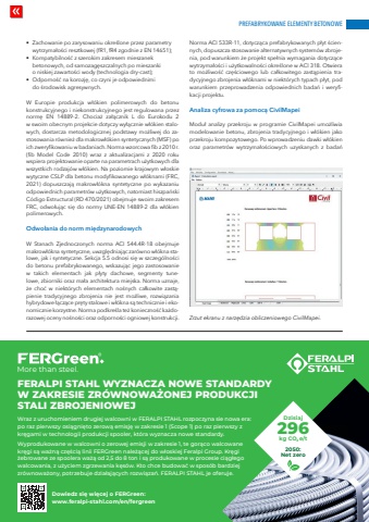 PREFABRYKOWANE ELEMENTY BETONOWEwww.cpi-worldwide.com%u0009 ZBI %u2013 Zak%u0142ady Betonowe International %u2013 5 | 2025 127%u2022 Zachowanie po zarysowaniu okre%u015blone przez parametry wytrzyma%u0142o%u015bci resztkowej (fR1, fR4 zgodnie z EN 14651);%u2022 Kompatybilno%u015b%u0107 z szerokim zakresem mieszanek betonowych, od samozag%u0119szczalnych po mieszanki o niskiej zawarto%u015bci wody (technologia dry-cast);%u2022 Odporno%u015b%u0107 na korozj%u0119, co czyni je odpowiednimi do %u015brodowisk agresywnych.W Europie produkcja w%u0142%u00f3kien polimerowych do betonu konstrukcyjnego i niekonstrukcyjnego jest regulowana przez norm%u0119 EN 14889-2. Chocia%u017c za%u0142%u0105cznik L do Eurokodu 2 w swoim obecnym projekcie dotyczy wy%u0142%u0105cznie w%u0142%u00f3kien stalowych, dostarcza metodologicznej podstawy mo%u017cliwej do zastosowania r%u00f3wnie%u017c dla makrow%u0142%u00f3kien syntetycznych (MSF) po ich zweryfikowaniu w badaniach. Norma wzorcowa fib z 2010 r. (fib Model Code 2010) wraz z aktualizacjami z 2020 roku wspiera projektowanie oparte na parametrach u%u017cytkowych dla wszystkich rodzaj%u00f3w w%u0142%u00f3kien. Na poziomie krajowym w%u0142oskie wytyczne CSLP dla betonu modyfikowanego w%u0142%u00f3knami (FRC, 2021) dopuszczaj%u0105 makrow%u0142%u00f3kna syntetyczne po wykazaniu odpowiednich parametr%u00f3w u%u017cytkowych, natomiast hiszpa%u0144ski C%u00f3digo Estructural (RD 470/2021) obejmuje swoim zakresem FRC, odwo%u0142uj%u0105c si%u0119 do normy UNE-EN 14889-2 dla w%u0142%u00f3kien polimerowych.Odwo%u0142ania do norm mi%u0119dzynarodowychW Stanach Zjednoczonych norma ACI 544.4R-18 obejmuje makrow%u0142%u00f3kna syntetyczne, uwzgl%u0119dniaj%u0105c zar%u00f3wno w%u0142%u00f3kna stalowe, jak i syntetyczne. Sekcja 5.5 odnosi si%u0119 w szczeg%u00f3lno%u015bci do betonu prefabrykowanego, wskazuj%u0105c jego zastosowanie w takich elementach jak p%u0142yty dachowe, segmenty tunelowe, zbiorniki oraz ma%u0142a architektura miejska. Norma uznaje, %u017ce cho%u0107 w niekt%u00f3rych elementach no%u015bnych ca%u0142kowite zast%u0105pienie tradycyjnego zbrojenia nie jest mo%u017cliwe, rozwi%u0105zania hybrydowe %u0142%u0105cz%u0105ce pr%u0119ty stalowe i w%u0142%u00f3kna s%u0105 technicznie i ekonomicznie korzystne. Norma podkre%u015bla te%u017c konieczno%u015b%u0107 ka%u017cdorazowej oceny no%u015bno%u015bci oraz odporno%u015bci ogniowej konstrukcji.Norma ACI 533R-11, dotycz%u0105ca prefabrykowanych p%u0142yt %u015bciennych, dopuszcza stosowanie alternatywnych system%u00f3w zbrojenia, pod warunkiem %u017ce projekt spe%u0142nia wymagania dotycz%u0105ce wytrzyma%u0142o%u015bci i u%u017cytkowalno%u015bci okre%u015blone w ACI 318. Otwiera to mo%u017cliwo%u015b%u0107 cz%u0119%u015bciowego lub ca%u0142kowitego zast%u0105pienia tradycyjnego zbrojenia w%u0142%u00f3knami w niekt%u00f3rych typach p%u0142yt, pod warunkiem przeprowadzenia odpowiednich bada%u0144 i weryfikacji projektu.Analiza cyfrowa za pomoc%u0105 CivilMapeiModu%u0142 analizy przekroju w programie CivilMapei umo%u017cliwia modelowanie betonu, zbrojenia tradycyjnego i w%u0142%u00f3kien jako przekroju kompozytowego. Po wprowadzeniu dawki w%u0142%u00f3kien oraz parametr%u00f3w wytrzyma%u0142o%u015bciowych uzyskanych z bada%u0144 Zrzut ekranu z narz%u0119dzia obliczeniowego CivilMapei.More than steel.FERALPI STAHL WYZNACZA NOWE STANDARDY W ZAKRESIE ZR%u00d3WNOWA%u017bONEJ PRODUKCJI STALI ZBROJENIOWEJWraz z uruchomieniem drugiej walcowni w FERALPI STAHL rozpoczyna sie nowa era:po raz pierwszy osi%u0105gni%u0119to zerow%u0105 emisj%u0119 w zakresie 1 (Scope 1) po raz pierwszy z kr%u0119gami w technologii produkcji spooler, kt%u00f3ra wyznacza nowe standardy.Wyprodukowane w walcowni o zerowej emisji w zakresie 1, te gor%u0105co walcowane kr%u0119gi s%u0105 wa%u017cn%u0105 cz%u0119%u015bci%u0105 linii FERGreen nale%u017c%u0105cej do w%u0142oskiej Feralpi Group. Kr%u0119gi %u017cebrowane ze spoolera wa%u017c%u0105 od 2,5 do 8 ton i s%u0105 produkowane w procesie ci%u0105g%u0142ego walcowania, z u%u017cyciem zgrzewania k%u0119s%u00f3w. Kto chce budowa%u0107 w spos%u00f3b bardziej zr%u00f3wnowa%u017cony, potrzebuje dzia%u0142aj%u0105cych rozwi%u0105za%u0144. FERALPI STAHL je oferuje.Dowiedz si%u0119 wi%u0119cej o FERGreen: www.feralpi-stahl.com/en/fergreenDzisiaj296kg CO2e/t2050:Net zero