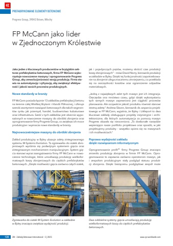 PREFABRYKOWANE ELEMENTY BETONOWE130 ZBI %u2013 Zak%u0142ady Betonowe International %u2013 5 | 2025 www.cpi-worldwide.comJako jeden z kluczowych producent%u00f3w w brytyjskim sektorze prefabrykat%u00f3w betonowych, firma FP McCann wykorzystuje nowoczesne maszyny i oprogramowanie Progress Group, aby zrewolucjonizowa%u0107 swoj%u0105 produkcj%u0119. Firma stawia na automatyzacj%u0119 i cyfryzacj%u0119, aby zwi%u0119kszy%u0107 efektywno%u015b%u0107 i jako%u015b%u0107 swoich proces%u00f3w produkcyjnych.Nowe standardy w bran%u017cyFP McCann posiada %u0142%u0105cznie 13 zak%u0142ad%u00f3w prefabrykacji betonu na terenie ca%u0142ej Wielkiej Brytanii i Irlandii P%u00f3%u0142nocnej, i oferuje szeroki asortyment rozwi%u0105za%u0144 betonowych dla takich segment%u00f3w rynku jak przemys%u0142, handel, budownictwo kubaturowe oraz infrastruktura. Sze%u015b%u0107 z tych zak%u0142ad%u00f3w jest obecnie wyposa%u017conych w nowoczesne maszyny do obr%u00f3bki zbrojenia oraz oprogramowanie firmy Progress Group, co zwi%u0119ksza ich moce produkcyjne i wyznacza nowe standardy w bran%u017cy.Najnowocze%u015bniejsze maszyny do obr%u00f3bki zbrojeniaZak%u0142ad produkcyjny w Byley ukazuje zalety zintegrowanego systemu M-Systems Evolution. Ta zgrzewarka do siatek zbrojeniowych wyr%u00f3%u017cnia si%u0119 podw%u00f3jnym systemem gi%u0119cia oraz zintegrowanym mechanizmem manipulacyjnym. System gi%u0119cia stanowi wyraz zaanga%u017cowania firmy FP McCann w nowoczesne technologie, kt%u00f3re umo%u017cliwiaj%u0105 produkcj%u0119 wielkoformatowych koszy zbrojeniowych do ci%u0119%u017ckich prefabrykat%u00f3w betonowych. %u201eDzi%u0119ki mo%u017cliwo%u015bci gi%u0119cia zar%u00f3wno ca%u0142ych siatek, jak i pojedynczych pr%u0119t%u00f3w, mo%u017cemy skr%u00f3ci%u0107 czas produkcji koszy zbrojeniowych%u201d %u2013 m%u00f3wi David Norry, kierownik produkcji w zak%u0142adzie w Byley. Dzi%u0119ki tej funkcjonalno%u015bci zapotrzebowanie na zbrojenie ulega znacznemu zmniejszeniu, co przek%u0142ada si%u0119 na oszcz%u0119dno%u015bci koszt%u00f3w oraz ograniczenie odpad%u00f3w materia%u0142owych.%u201eJedn%u0105 z najwi%u0119kszych zalet tych maszyn jest ich integracja. Oszcz%u0119dza ona mn%u00f3stwo czasu, gdy%u017c dzi%u0119ki wykorzystaniu tych samych maszyn zapewniona jest ci%u0105g%u0142o%u015b%u0107 proces%u00f3w planowania. Ale oczywi%u015bcie jako%u015b%u0107 produktu r%u00f3wnie%u017c stanowi istotn%u0105 zalet%u0119.%u201d Andrew Slaven, kierownik ds. wsparcia projektowego w FP McCann, wyja%u015bnia, %u017ce Byley i Littleport to dwa kluczowe zak%u0142ady obs%u0142uguj%u0105ce projekty in%u017cynieryjne i architektoniczne, dla kt%u00f3rych automatyzacja za pomoc%u0105 maszyn Progress okaza%u0142a si%u0119 nieoceniona. %u201eTo doskona%u0142e narz%u0119dzie wspieraj%u0105ce nasze portfolio projektowe oraz spos%u00f3b, w jaki projektujemy produkty %u2013 wszystko opiera si%u0119 na maszynach i ich mo%u017cliwo%u015bciach.%u201dPoprawa wydajno%u015bci zak%u0142adu dzi%u0119ki rozwi%u0105zaniom informatycznymOprogramowanie profitYC firmy Progress Group znacz%u0105co zmieni%u0142o produkcj%u0119 zbrojenia w firmie FP McCann. Oprogramowanie to zapewnia zar%u00f3wno operatorom maszyn, jak i zespo%u0142om produkcyjnym sta%u0142y podgl%u0105d statusu produkcji zbrojenia. Dzi%u0119ki bie%u017c%u0105cemu podgl%u0105dowi zesp%u00f3%u0142 mo%u017ce FP McCann jako lider w Zjednoczonym Kr%u00f3lestwieProgress Group, 39042 Brixen, W%u0142ochyZgrzewarka do siatek M-System Evolution w zak%u0142adzie w Byley znacz%u0105co zwi%u0119ksza wydajno%u015b%u0107 produkcji.Dwa oddzielne systemy gi%u0119cia umo%u017cliwiaj%u0105 produkcj%u0119 wielkoformatowych koszy do ci%u0119%u017ckich prefabrykat%u00f3w betonowych.