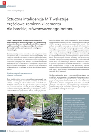 AKTUALNO%u015aCI14 ZBI %u2013 Zak%u0142ady Betonowe International %u2013 5 | 2025 www.cpi-worldwide.comZesp%u00f3%u0142 z Massachusetts Institute of Technology (MIT) opracowa%u0142 szkielet sztucznej inteligencji (SI), kt%u00f3ry pomaga producentom betonu w identyfikacji materia%u0142%u00f3w mog%u0105cych cz%u0119%u015bciowo zast%u0105pi%u0107 cement, przyczyniaj%u0105c si%u0119 zar%u00f3wno do redukcji koszt%u00f3w, jak i ograniczenia emisji gaz%u00f3w cieplarnianych.Cz%u0119%u015bciowe zast%u0119powanie cementu w celu osi%u0105gni%u0119cia takich oszcz%u0119dno%u015bci jest ju%u017c powszechnie stosowan%u0105 praktyk%u0105. Jako zast%u0119pcze materia%u0142y cementowe od dawna wykorzystywane s%u0105 produkty uboczne, takie jak popi%u00f3%u0142 lotny z produkcji w%u0119gla czy %u017cu%u017cel hutniczy z wytopu stali. Rosn%u0105ce zapotrzebowanie na te materia%u0142y zaczyna przewy%u017csza%u0107 ich dost%u0119pno%u015b%u0107, gdy%u017c bran%u017ca d%u0105%u017cy do ograniczenia wp%u0142ywu na klimat poprzez zwi%u0119kszenie ich wykorzystania, co sprawia, %u017ce pilnie poszukiwane s%u0105 alternatywy.Selekcja materia%u0142%u00f3w wspomagana sztuczn%u0105 inteligencj%u0105Cho%u0107 istnieje wiele innych potencjalnych zast%u0119pczych materia%u0142%u00f3w cementowych, wyzwaniem pozostaje ich skuteczna selekcja i ocena pod k%u0105tem zastosowania w trwa%u0142ych konstrukcjach betonowych. Aby sprosta%u0107 temu wyzwaniu, zesp%u00f3%u0142 MIT pod kierownictwem adiunkta, dr. Sorousha Mahjoubiego, opublikowa%u0142 otwarty artyku%u0142 naukowy w czasopi%u015bmie Communications Materials wydawnictwa Nature, w kt%u00f3rym przedstawia opracowane przez siebie rozwi%u0105zanie. Z wykorzystaniem du%u017cych modeli j%u0119zykowych, w tym chatbot%u00f3w, zesp%u00f3%u0142 stworzy%u0142 szkielet oparty na uczeniu maszynowym, kt%u00f3ry ocenia i klasyfikuje potencjalne materia%u0142y na podstawie ich w%u0142a%u015bciwo%u015bci fizycznych i chemicznych. Szkielet przeprowadza%u0142 selekcj%u0119 materia%u0142%u00f3w na podstawie trzech wska%u017anik%u00f3w, wyprowadzonych z testu R3 opracowanego przez ASTM International do oceny reaktywno%u015bci zast%u0119pczych materia%u0142%u00f3w cementowych [1, 2]: wydzielanie ciep%u0142a podczas hydratacji, zu%u017cycie wodorotlenku wapnia (wapna) podczas hydratacji oraz spos%u00f3b wi%u0105zania lub adsorpcji wody na powierzchniach. Trzeci wska%u017anik mo%u017ce s%u0142u%u017cy%u0107 do po%u015bredniego okre%u015blania wydzielania ciep%u0142a w sytuacjach, gdy nie ma mo%u017cliwo%u015bci skorzystania z kalorymetr%u00f3w izometrycznych, co czyni ocen%u0119 reaktywno%u015bci bardziej dost%u0119pn%u0105. System przetworzy%u0142 ponad milion pr%u00f3bek ska%u0142 oraz setki tysi%u0119cy stron literatury, przyporz%u0105dkowuj%u0105c potencjalne materia%u0142y do 19 kategorii.Wed%u0142ug naukowc%u00f3w wiele z tych materia%u0142%u00f3w wykazuje potencja%u0142 do zastosowania w mieszankach betonowych przy minimalnym dodatkowym przetworzeniu, cz%u0119sto ograniczaj%u0105cym si%u0119 jedynie do zmielenia. Stwarza to nowe mo%u017cliwo%u015bci wykorzystania lokalnie dost%u0119pnych produkt%u00f3w ubocznych przemys%u0142u oraz odpad%u00f3w, wspieraj%u0105c bran%u017c%u0119 w rozszerzaniu portfolio zast%u0119pczych materia%u0142%u00f3w cementowych oraz promuj%u0105c gospodark%u0119 o obiegu zamkni%u0119tym.Sztuczna inteligencja MIT wskazuje cz%u0119%u015bciowe zamienniki cementu dla bardziej zr%u00f3wnowa%u017conego betonuSzkielet sztucznej inteligencjiZesp%u00f3%u0142 MIT pod kierownictwem dr. Sorousha Mahjoubiego (na zdj%u0119ciu) opracowa%u0142 szkielet oparty na uczeniu maszynowym, kt%u00f3ry ocenia i klasyfikuje cz%u0119%u015bciowe zamienniki cementu na podstawie ich w%u0142a%u015bciwo%u015bci fizycznych i chemicznych. Badanie podkre%u015bla potencja%u0142 materia%u0142%u00f3w takich jak odpady ceramiczne i materia%u0142y budowlane w zakresie poprawy zr%u00f3wnowa%u017cono%u015bci mieszanek betonowych.